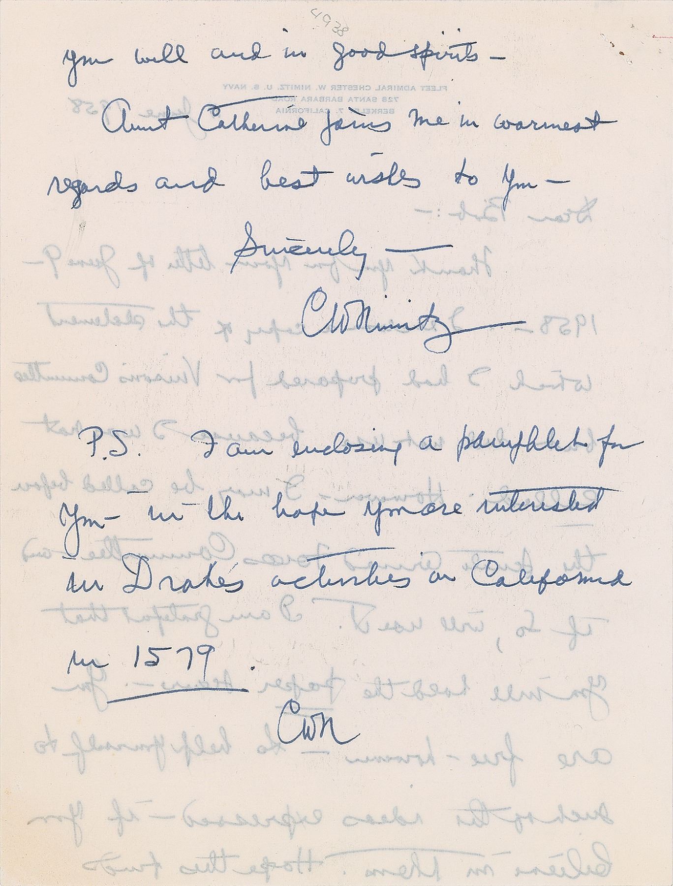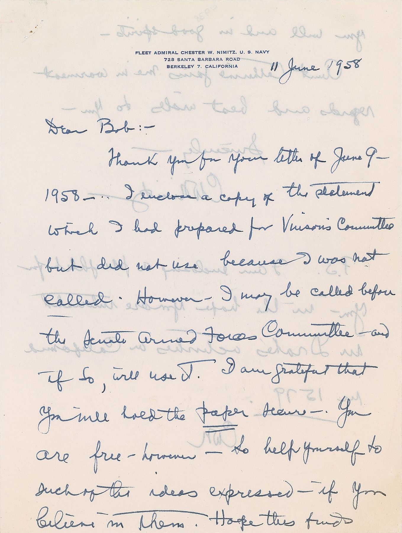 ALS signed “C. W. Nimitz,” one page both sides, 8 x 10.5, personal letterhead, June 11, 1958. Letter to Robert R. Gros, in full: "Thank you for your letter of June 9—1958—. I enclose a copy of the statement which I had prepared for Vinson's Committee but did not use because I was not called. However—I may be called before the Senate Armed Forces Committee—and if so, will use it. I am grateful that you will hold the paper secure—. You are free—however—So help yourself to such of the ideas expressed—if you believe in them. Hope this finds you well and in good spirits—Aunt Catherine joins me in warmest regards and best wishes to you—." Nimitz adds his initials, "CWN," to a closing postscript: "I am enclosing a pamphlet for you—in the hope you are interested in Drake's activities in California in 1579." In fine condition, with staple holes to the upper left corner. Accompanied by a copy of Gros's response letter, dated June 23, 1958, as well as a photocopy of the "statement" Nimitz was preparing to give before one of the Armed Forces Committees, which reveals an interesting viewpoint of the armed services and the tactical and strategic balance to prepare for a future war.