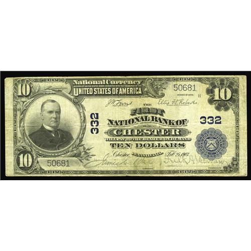<B>Chester, PA</B></I> - $10 1902 Plain Back Fr. 624 <B>The First NB</B></I> Ch. # 332<BR>James C. Baker and Frank A. Howard managed this bank leaving behind this crispy <B>Fine</B></I> note.