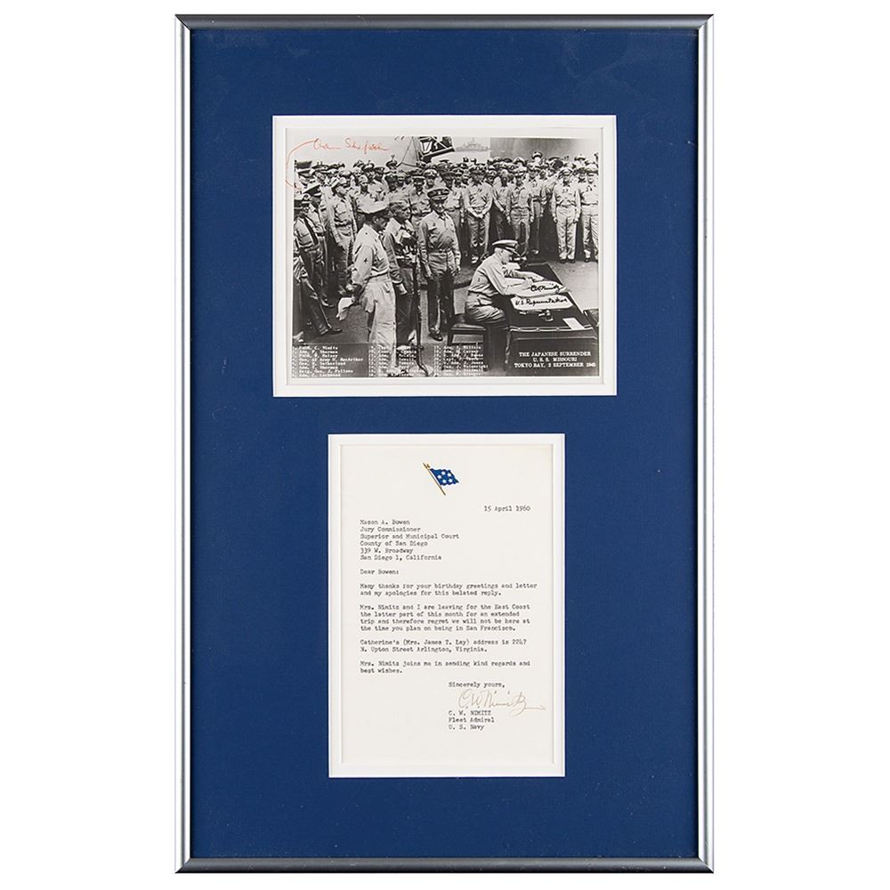 TLS signed “C. W. Nimitz,†one page, 5 x 7.5, Five Star Fleet Admiral letterhead, April 15, 1960. Letter to Mason A. Bowen, in part: "Many thanks for your birthday greetings and letter and my apologies for this belated reply. Mrs. Nimitz and I are leaving for the East Coast the latter part of this month for an extended trip and therefore regret we will not be here at the time you plan on being in San Francisco." Attractively double-matted and framed with a photo of the Japanese surrender on the USS Missouri (bearing a pre-printed signature) to an overall size of 12.75 x 20.5. In fine condition.