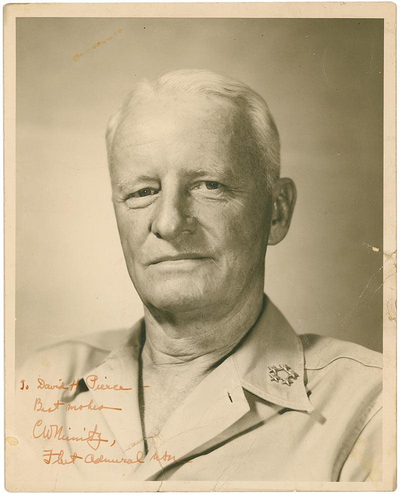 Vintage matte-finish 8 x 10 photo, signed and inscribed in brown ink “To David H. Pierce–Best wishes, C. W. Nimitz, Fleet Admiral USN.” In good condition, with heavy creases to lower right, other scattered noticeable creases, rippling to top, and some scattered light damp staining.