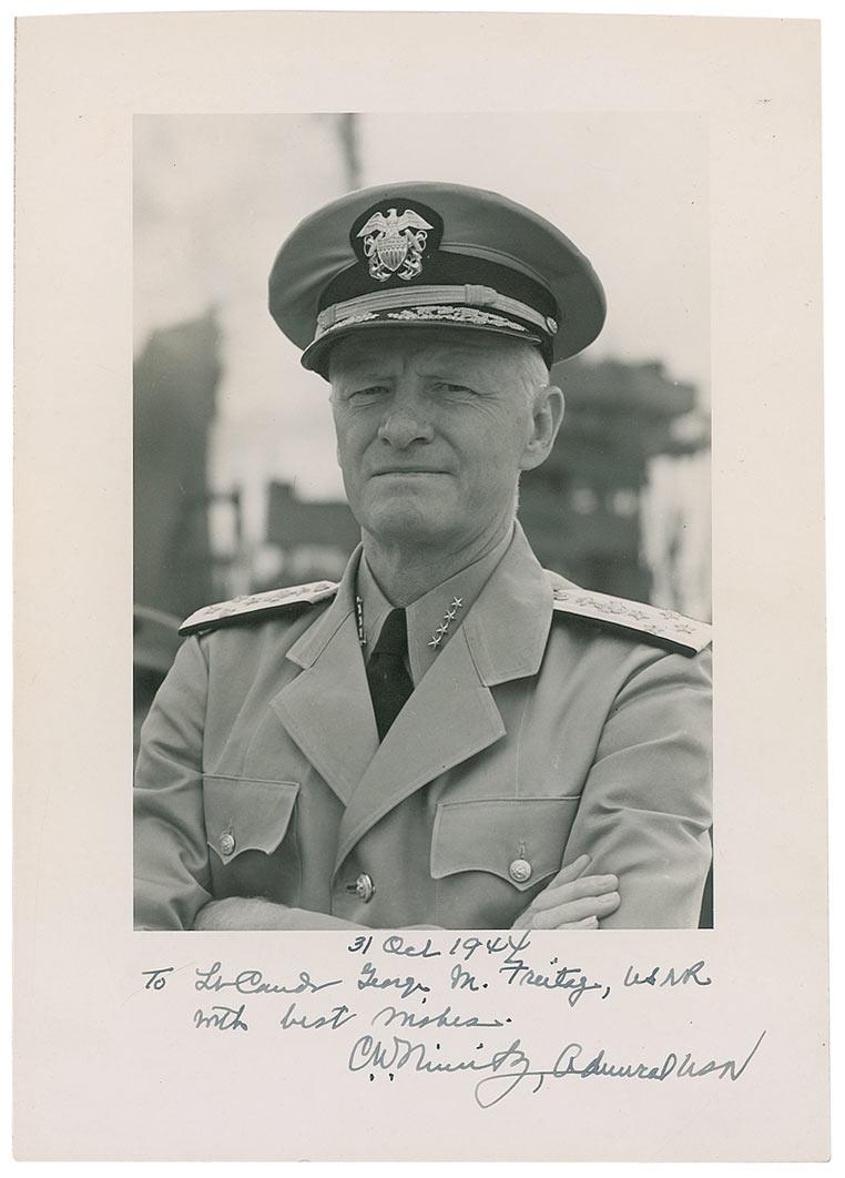 Vintage matte-finish 7 x 10 photo, signed and inscribed in fountain pen “To Lt. Cmdr. George M. Freitez, USNR, with best wishes, C. W. Nimitz, Admiral, USN, 31 Oct. 1944.” In fine condition, with a couple spots of soiling and very faint silvering to some of the darker portions. Five days earlier, the Allies emerged victorious in the Battle of Leyte Gulf, considered by many to be the largest naval battle of World War II (and some would argue in naval history), essentially ending any further actions by the Japanese navy.