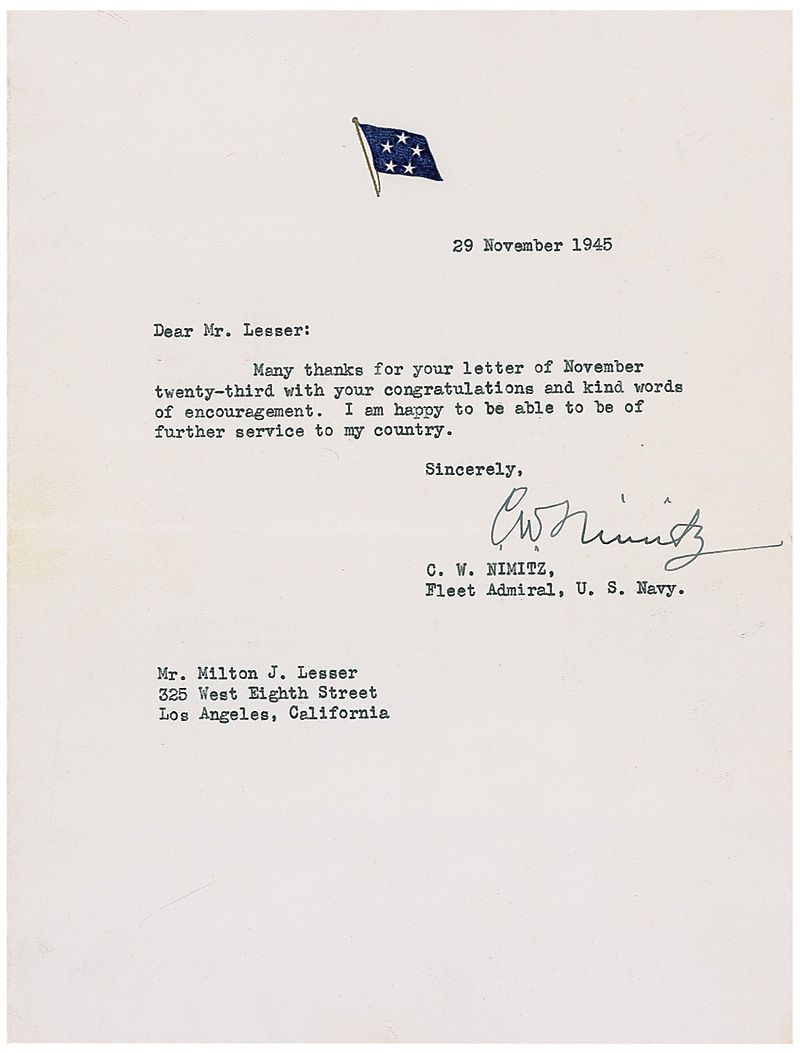 TLS signed “C. W. Nimitz,” one page, 6.5 x 8.5, five-star admiral letterhead, November 29, 1945. Letter to a Milton J. Lesser. In full: “Many thanks for your letter of November twenty-third with your congratulations and kind words of encouragement. I am happy to be able to be of further service to my country.” In fine condition, with a central horizontal fold through the signature, and a few mild surface creases.
