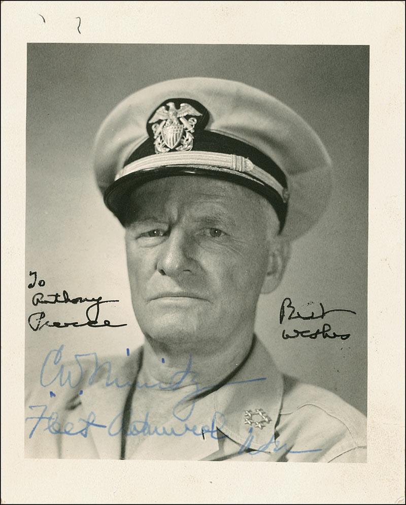 Vintage matte-finish 4 x 5 head-and-shoulders photo, inscribed in another hand in black ink, “To Anthony Pierce, Best wishes,” and signed in blue ink, “C. W. Nimitz, Fleet Admiral USN.” In very good condition, with signature a shade light, and rippling to all four edges.