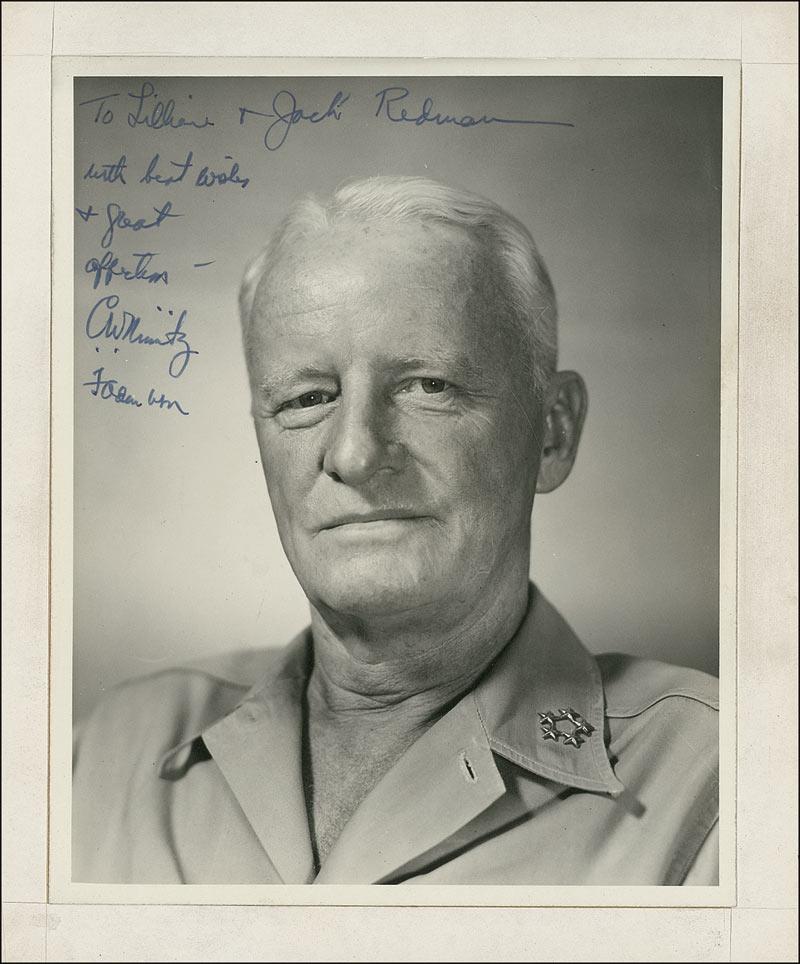 Vintage matte-finish 8 x 10 portrait of Nimitz in uniform, signed and inscribed in fountain pen “To Lillian & Jack Redman with best wishes & great affection—C. W. Nimitz. F. Adm. USN.” Affixed to a slightly larger piece of cardstock. In fine condition.