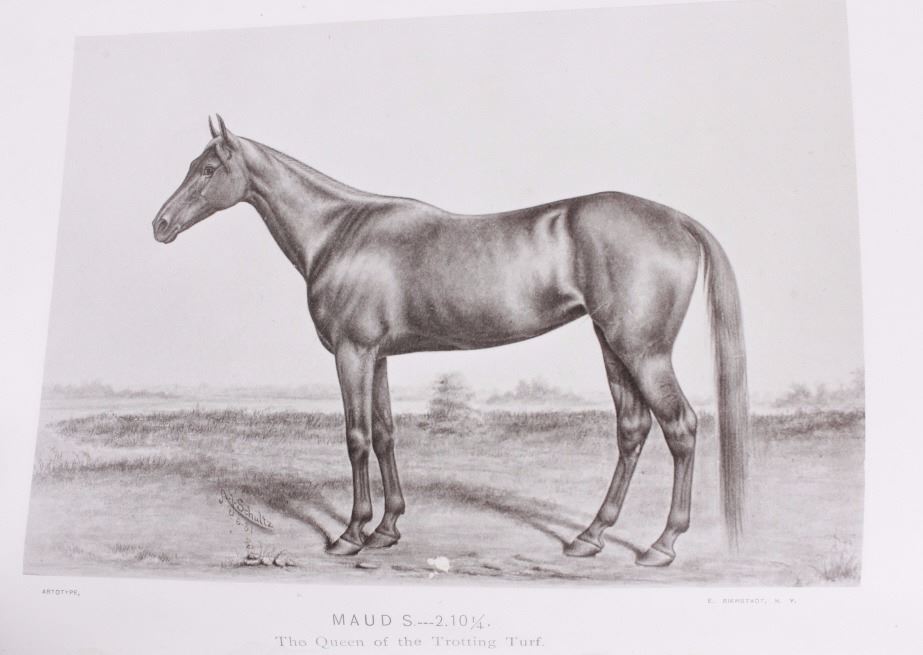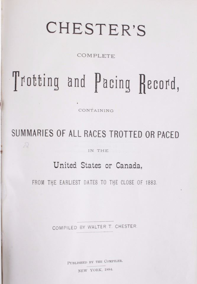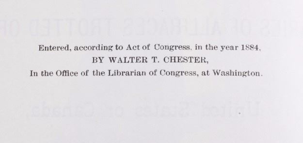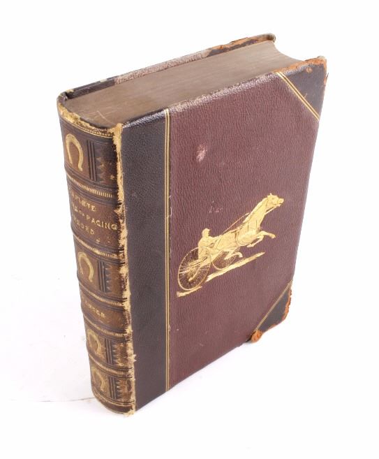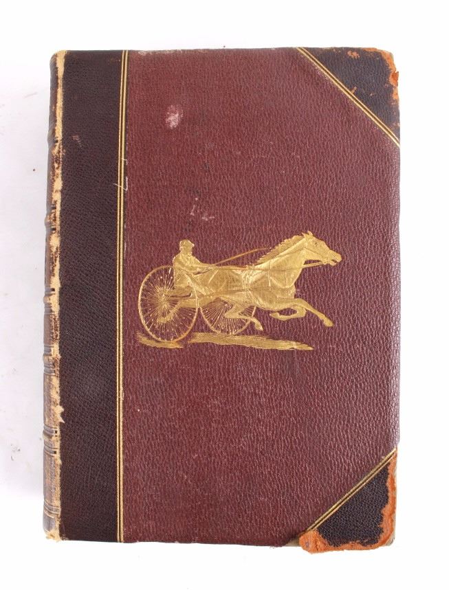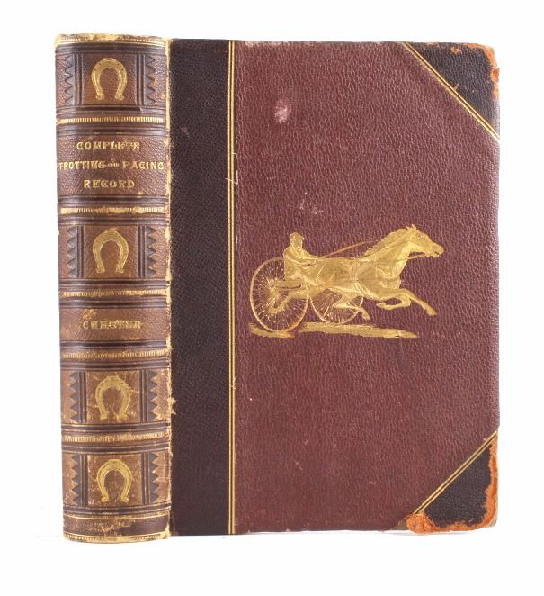 This lot features a rare 1884 1st Ed. book entitled "Chester's Complete Trotting and Pacing Records" containing summaries of all races trotted or paced in the United States or Canada from the earliest dates to the close of 1883. The book is by author Walter T. Chester, and features an inclusive account of equine racing and trotting history including detailed lineage information about each horse. It contains many lithographs of famous horses, and is a perfect reference book for any race horse enthusiast. The book is leather bound with marbleized end papers and gilt lettering. It is in good condition with tight binding. Measures: 7" W x 9 3/4" H x 2" D