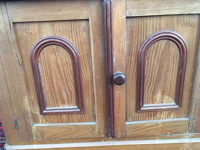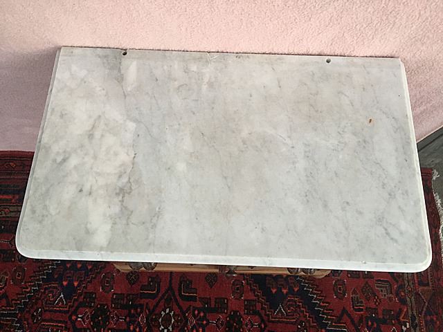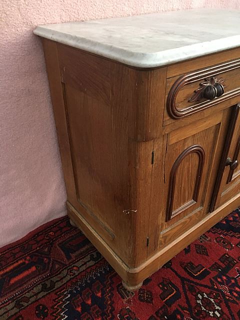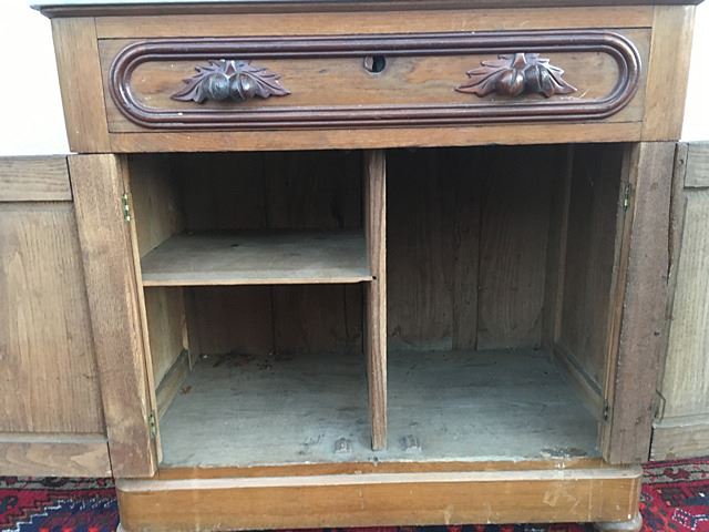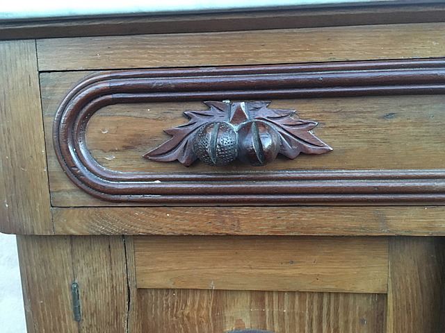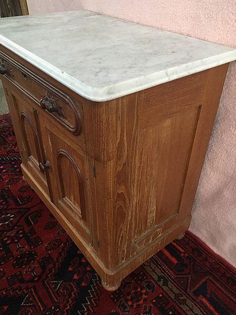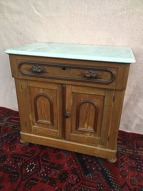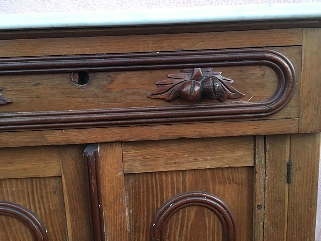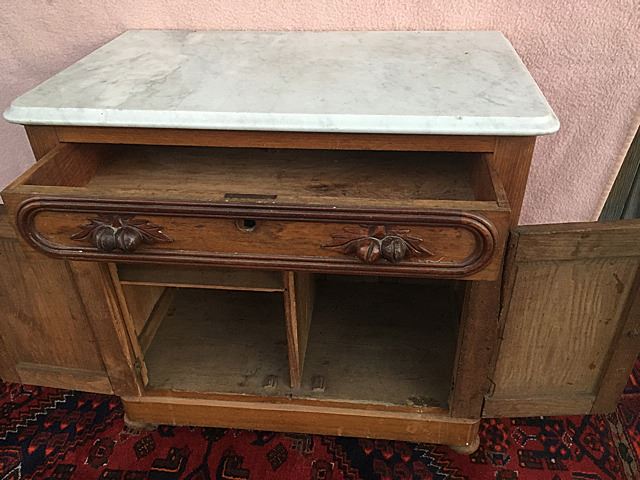 Chestnut and Walnut marble top commode with 2 doors, 1 drawer, acorn carved pulls and marble top. Measures approx. 30" wide x 18" deep x 30" tall.