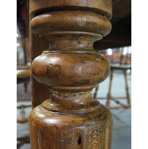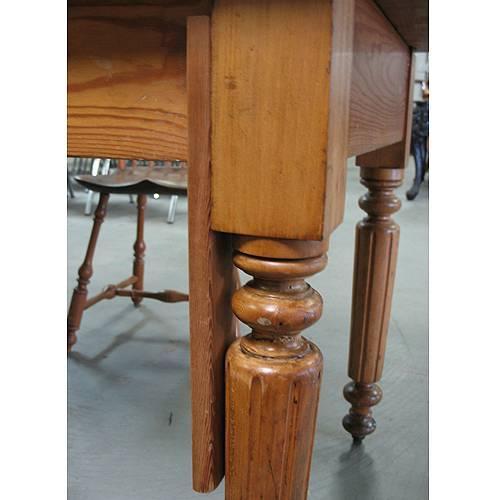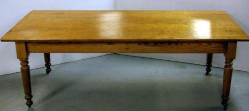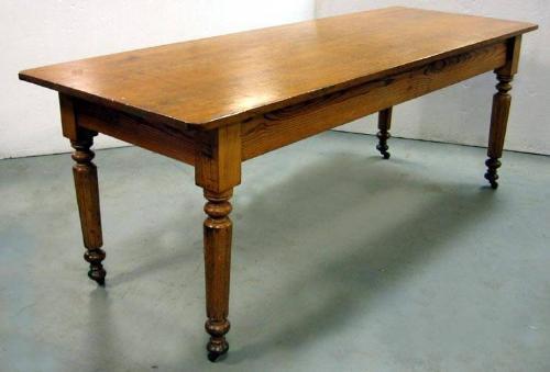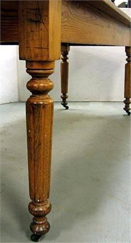 Chestnut farm table; rectangular top with rounded corners; round tapered fluted legs; turnings at top of legs and ankles; bun feet on casters; late 19th C.; 30 1/4" x 84 1/2" x 29 1/2" (one leg has been repaired, normal wear)
