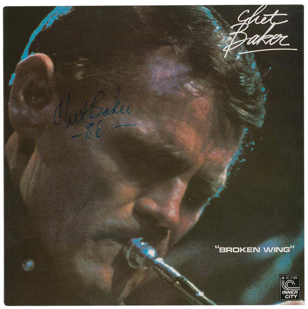 Tragic jazz great whose intimate playing style established him as a great talent until his drug-related death in 1988. Broken Wing album signed on the front cover in blue felt tip, “Chet Baker —86—.” In fine condition, with a couple of tiny edge creases and a small crease on the back cover. The record is included. An intense cover image of the great musician.