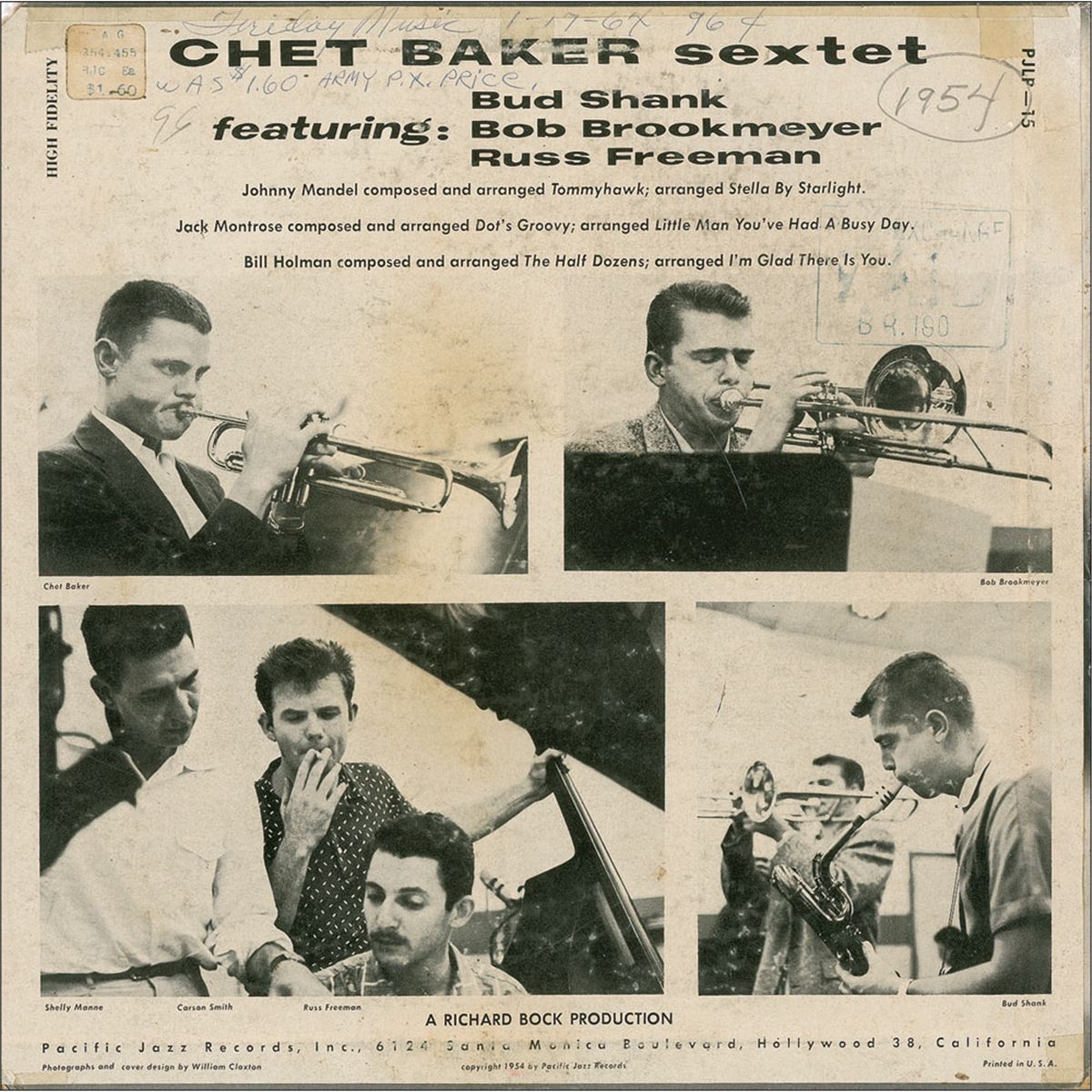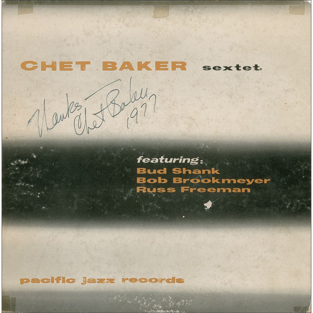 Chet Baker Sextet album, 10.25 x 10.25, signed on the front in black felt tip, “Thanks—Chet Baker, 1977.” In very good condition, with moderate rubbing, reparative tape to the corners and along the top edge, a small area of paper loss in the center of the front cover, a small price sticker and notations in another hand on the back cover, and light brushing to the beginning of the sentiment, none of which detract from the way the Cool Jazz icon’s bright signature stands out against the neutral background. The record is included.