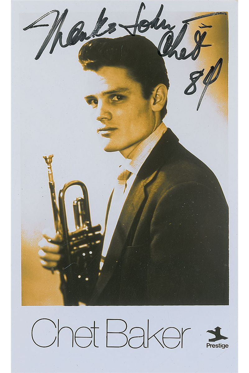 Tragic jazz great whose intimate playing style established him as a great talent until his drug-related death in 1988. Glossy 5 x 8 photo of Baker holding his trumpet, signed and inscribed in black felt tip, “Thanks John, Chet 84.” In fine condition, with some scattered light creases, none affecting signature or inscription, and a few light spots to finish.