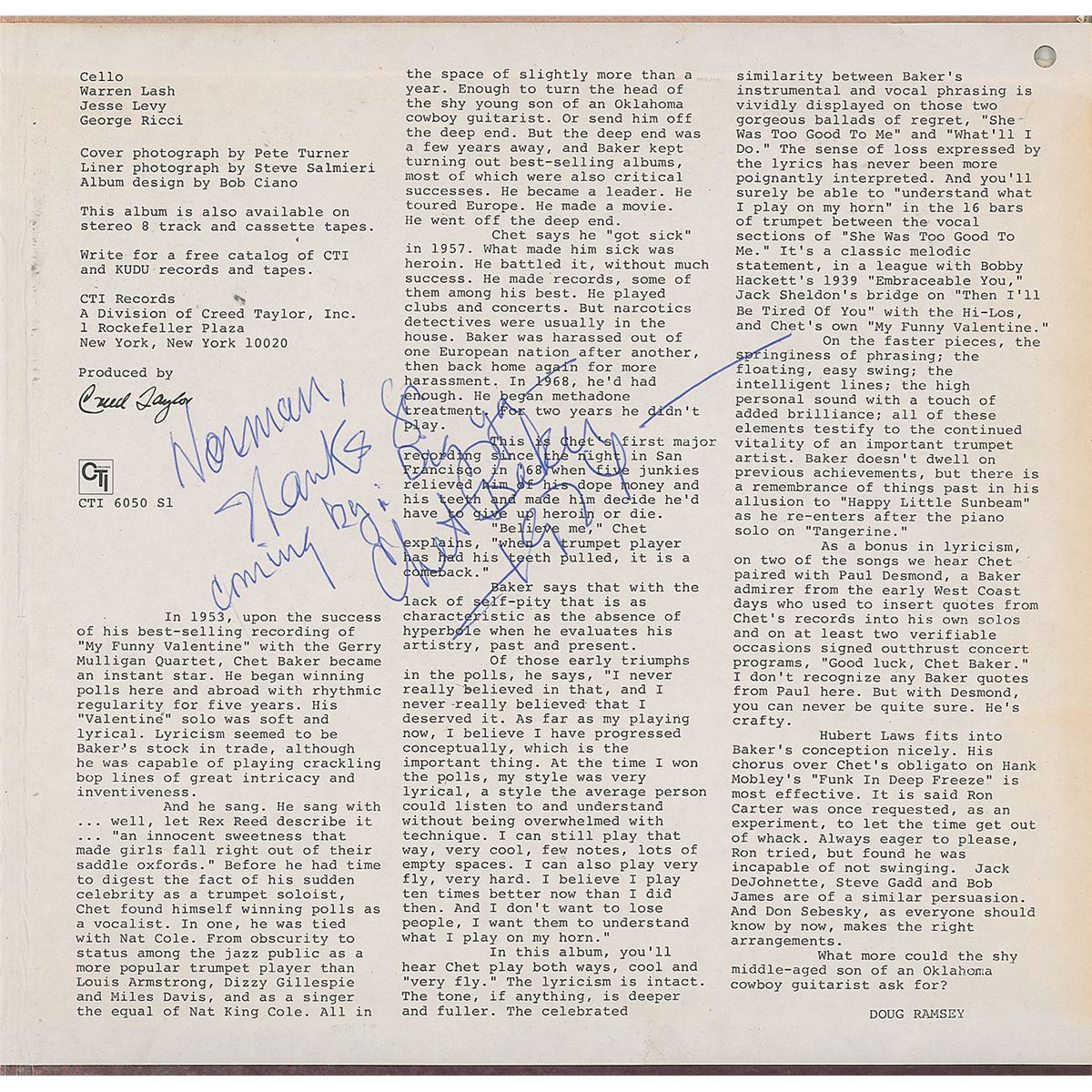 She Was Too Good to Me album signed and inscribed inside the gatefold in blue ballpoint, “Norman, Thanks for coming by. Dig ya—Chet Baker, 1974.” In fine condition, with a discount punch and slight bend to the upper right corner. The record is included.