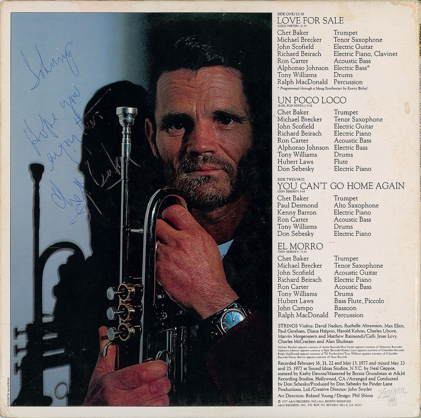 You Can't Go Home Again album signed and inscribed on the back cover in blue ballpoint, "Johnny, Hope you enjoy this, Chet Baker, 81." In fine condition, with light creasing and edge wear. The record is included.