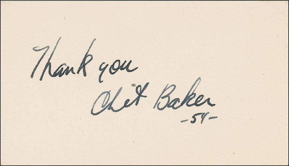 Tragic jazz great whose intimate playing style established him as a great talent until his drug related death in 1988. Scarce fountain pen signature, “Thank you, Chet Baker—54—,” on an off-white 3.5 x 2 card. In fine condition. Accompanied by two unsigned postcard photos.