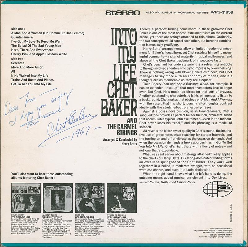 Tragic jazz great whose intimate playing style established him as a great talent until his drug related death in 1988. Into My Life album signed and inscribed on the back cover in blue ballpoint, “Dear Tom—I hope you enjoy the music. Chet Baker 1967.” In fine condition, with some mild toning to back cover and scattered light surface wear and creases to front cover. The record is included.