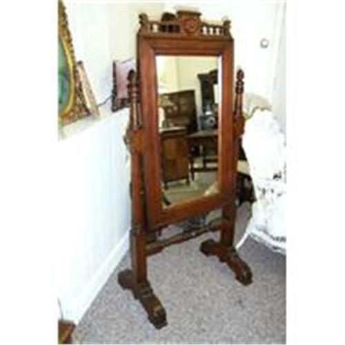 Small all original walnut Victorian cheval mirror with brass adjustment hardware and spindled top.