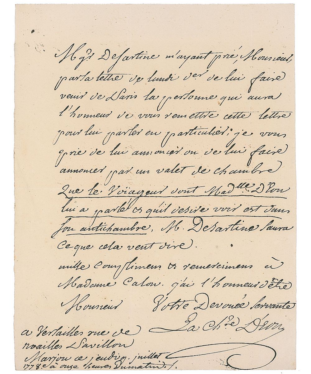 French diplomat, spy and soldier (1728–1810) whose first 49 years were spent as a man, and whose last 33 years were spent as a woman. ALS in French, signed with the feminine form of the name, “La Chre D’Eon,” one page, 6.5 x 8.25, July 9, 1778. Letter to cartographer Nicolas de Calon. In part (translated): “Mgr. De Sartine has asked me…to have sent to him in Paris for a private conversation the person who will have the honor of transmitting this letter. I ask you to announce or to have announced by a valet de chambre that the traveller Mademoiselle d’Eon talked to him about and whom he wishes to see is in his antechambre. M. De Sartine will know what that means.” In fine condition, with intersecting folds, one through a single letter of signature. Sartine was head of Louis XV’s secret police.