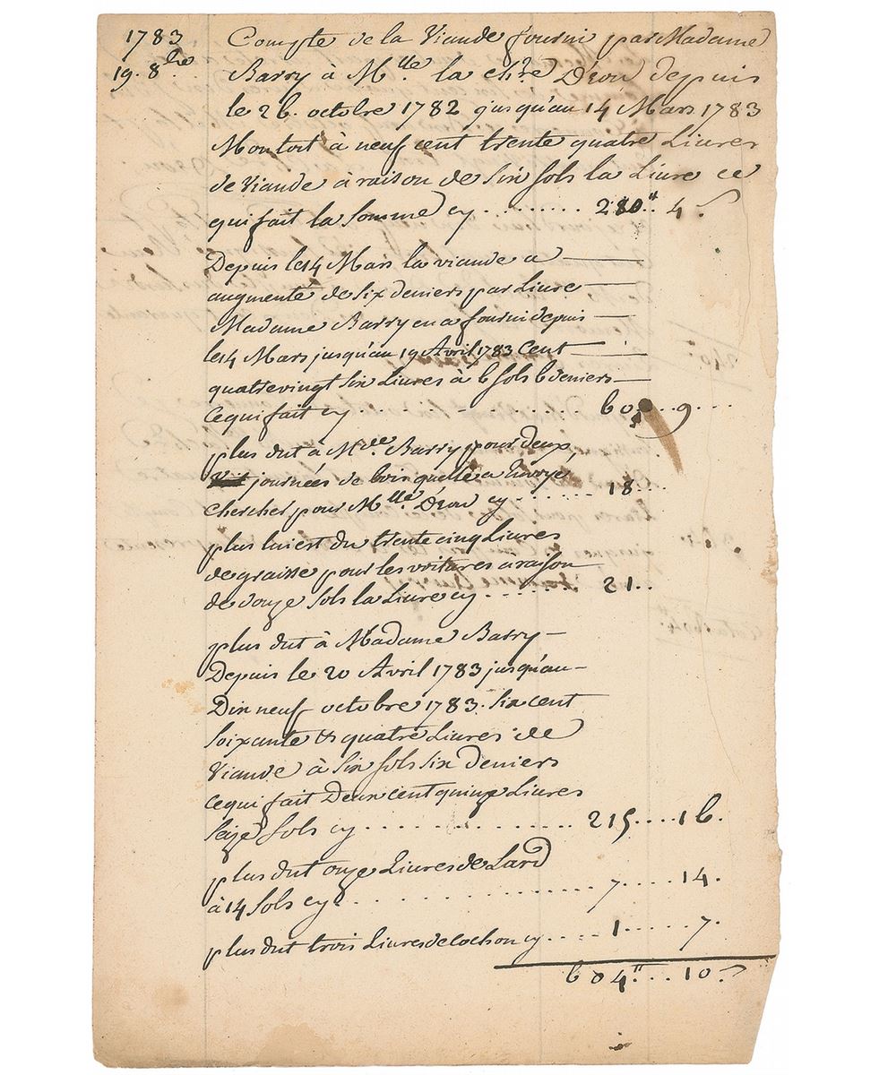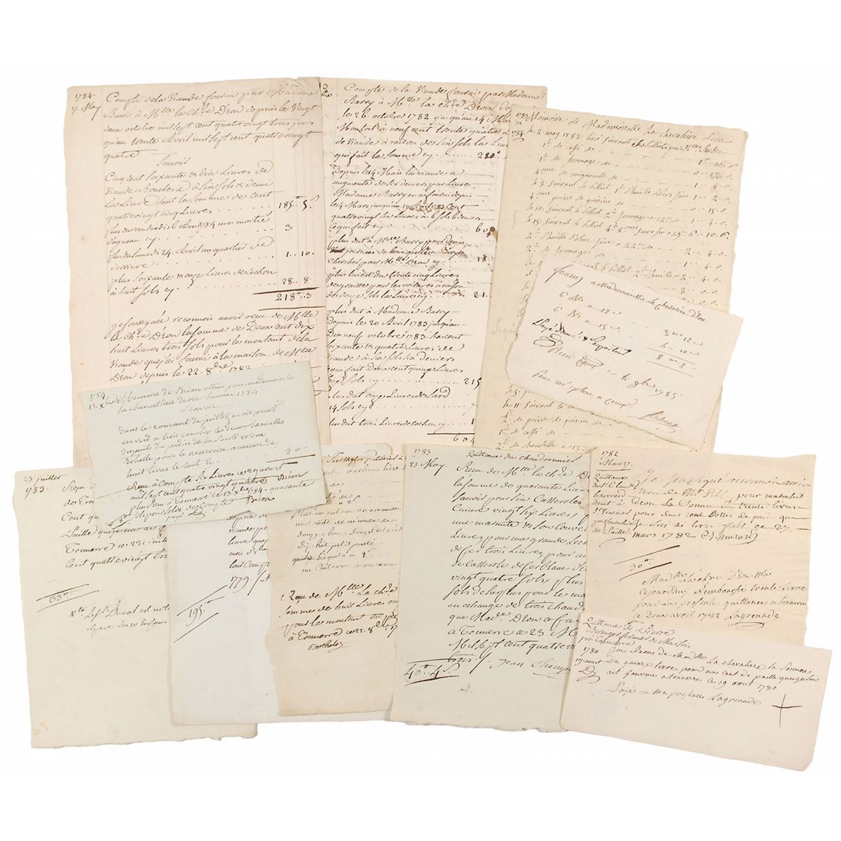 French diplomat, spy, and soldier (1728–1810) whose first 49 years were spent as a man, and whose last 33 years were spent as a woman. Archive of eleven untranslated receipts or ledger pages listing household expenses such as prices for firewood, lumber, clothing, and other items, dated from 1779 to 1785. Seven are ADSs handwritten by Chevalier d’Eon and signed in the third-person within the text, with variations including “M’lle la ch’re D’Eon,” “M’lle D’Eon,” “Mad’lle la ch’re D’Eon,” with one initialed at the conclusion instead, “D.” Two are in another hand and signed at the conclusion, one endorsed and initialed “D,” and the other signed “La ch’re D’Eon.” The final two are written in the hand of Chevalier d’Eon, but left unsigned. In overall fine condition, with expected document wear. Accompanied by three additional documents in other hands. An especially interesting series of documents, as d’Eon identifies as ‘mademoiselle’ several times throughout, providing a level of insight into Chevalier d’Eon’s unusual story.