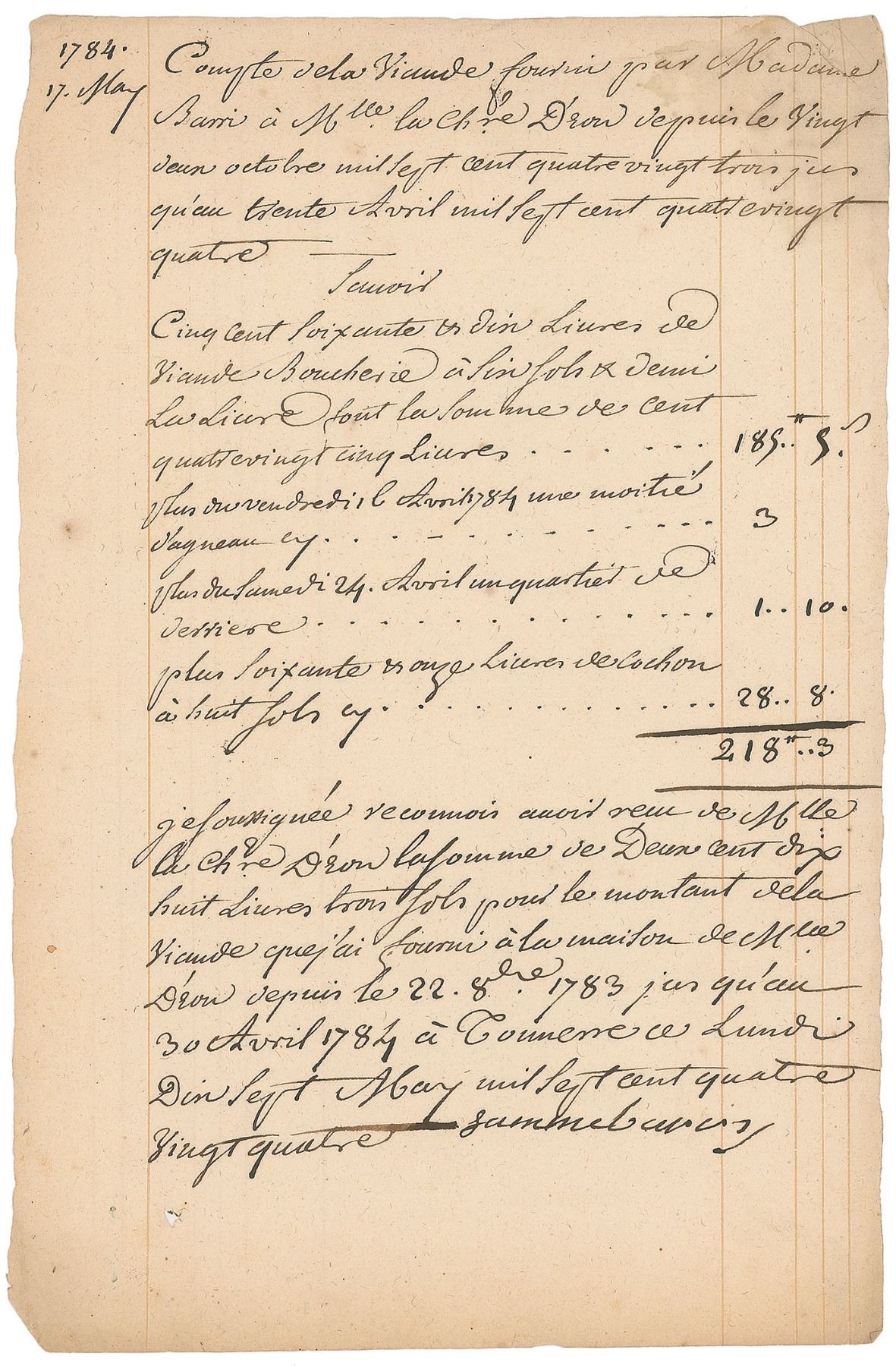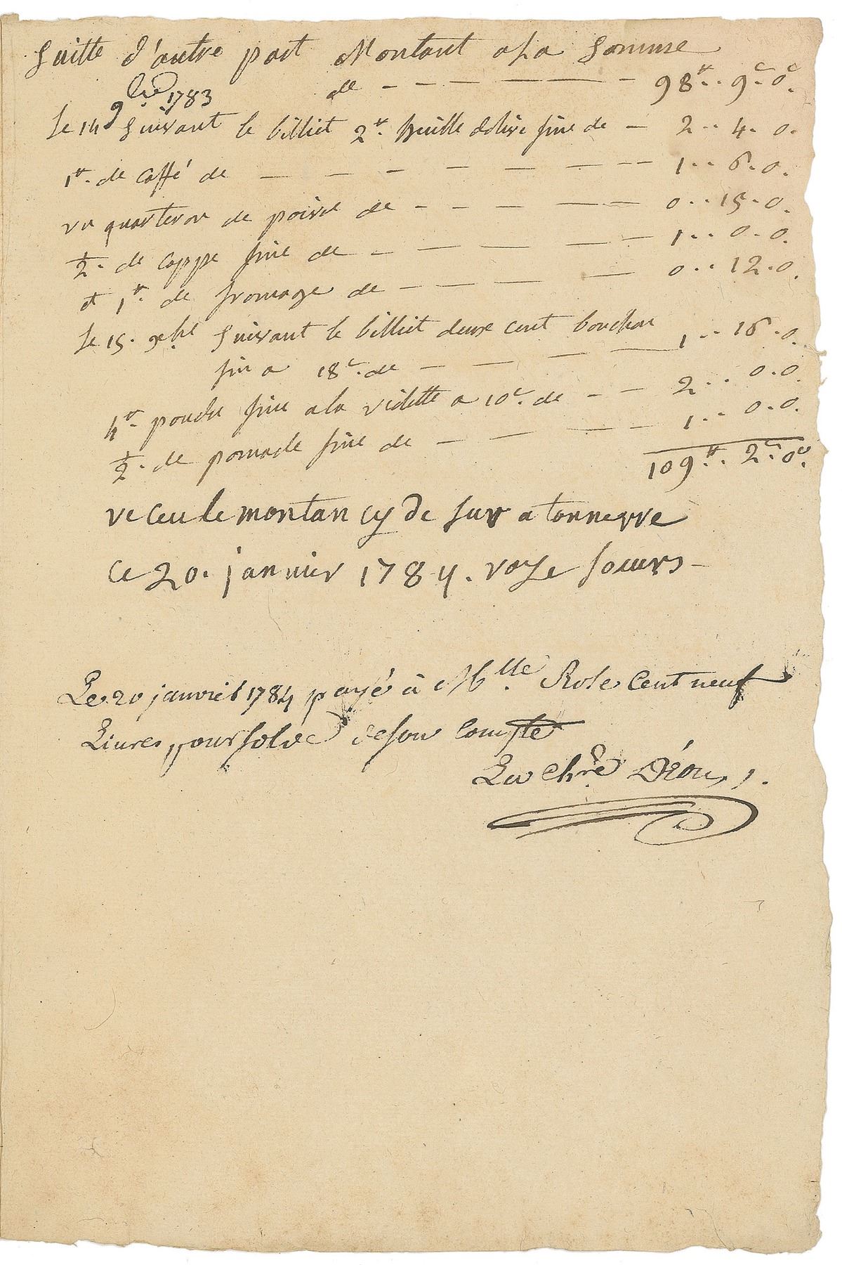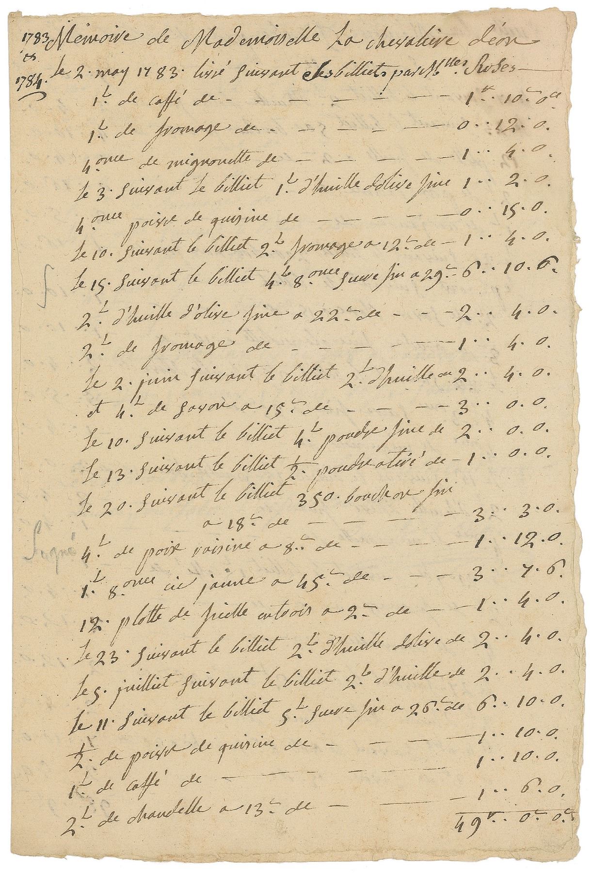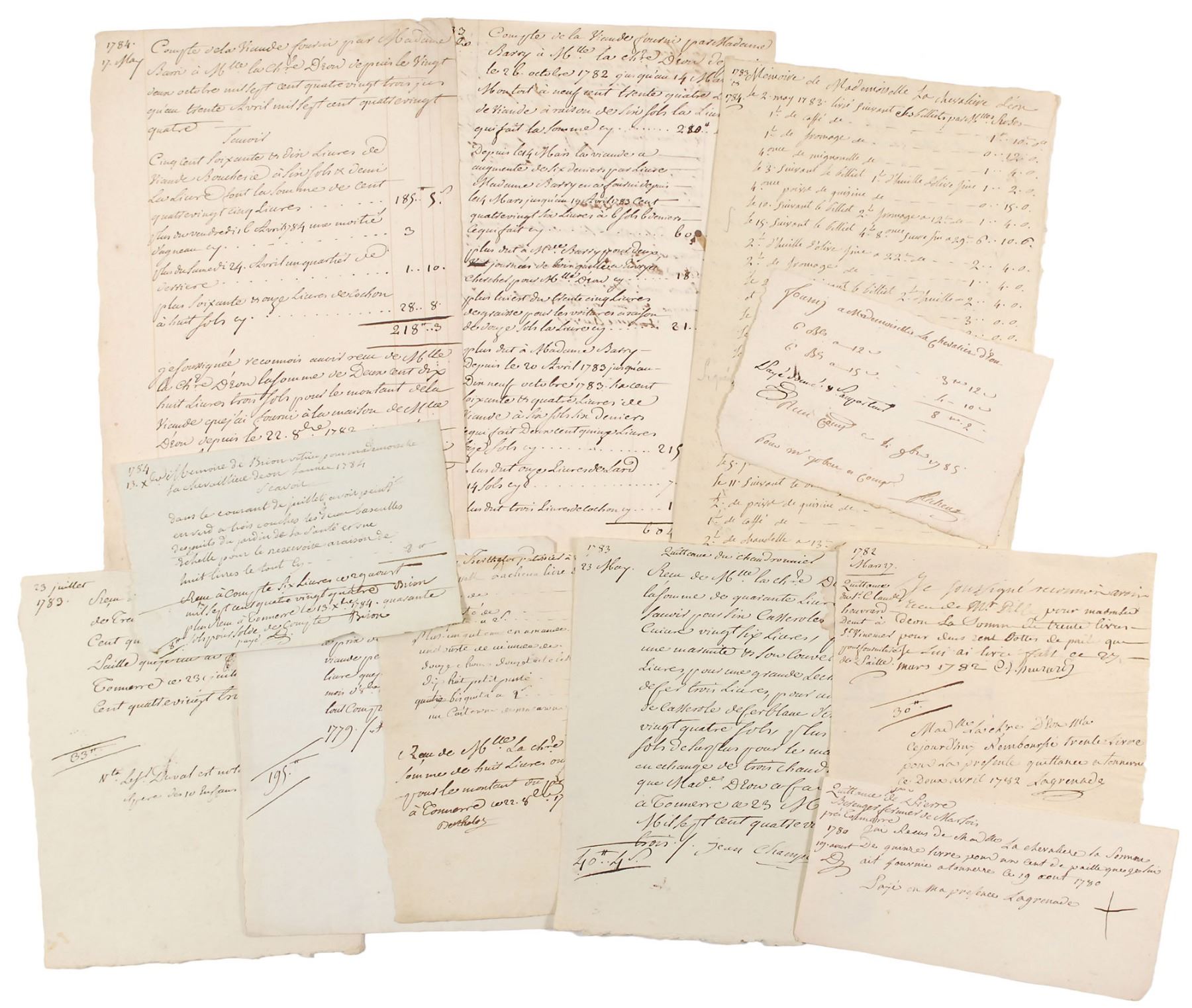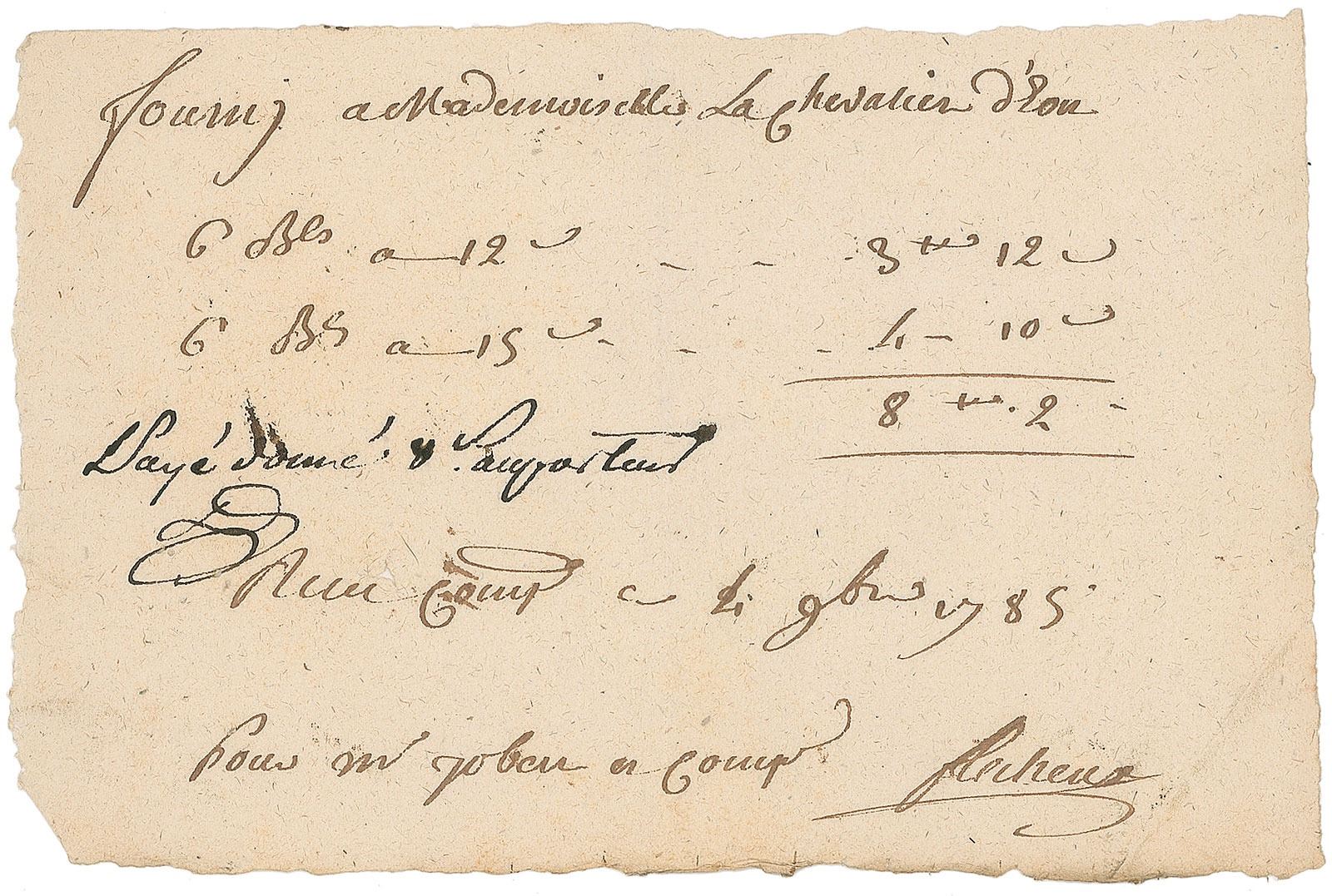 French diplomat, spy, and soldier (1728–1810) whose first 49 years were spent as a man, and whose last 33 years were spent as a woman. Archive of eleven untranslated receipts or ledger pages listing household expenses such as prices for firewood, lumber, clothing, and other items, dated from 1779 to 1785. Seven are ADSs handwritten by Chevalier d'Eon and signed in the third-person within the text, with variations including "M'lle la ch're D'Eon," "M'lle D'Eon," "Mad'lle la ch're D'Eon," with one initialed at the conclusion instead, "D." Two are in another hand and signed at the conclusion, one endorsed and initialed "D," and the other signed "La ch're D'Eon." The final two are written in the hand of Chevalier d'Eon, but left unsigned. In overall very good to fine condition, with expected document wear. Accompanied by three additional documents in other hands. An especially interesting series of documents, as d'Eon identifies as 'mademoiselle' several times throughout, providing a level of insight into Chevalier d'Eon's unusual story.