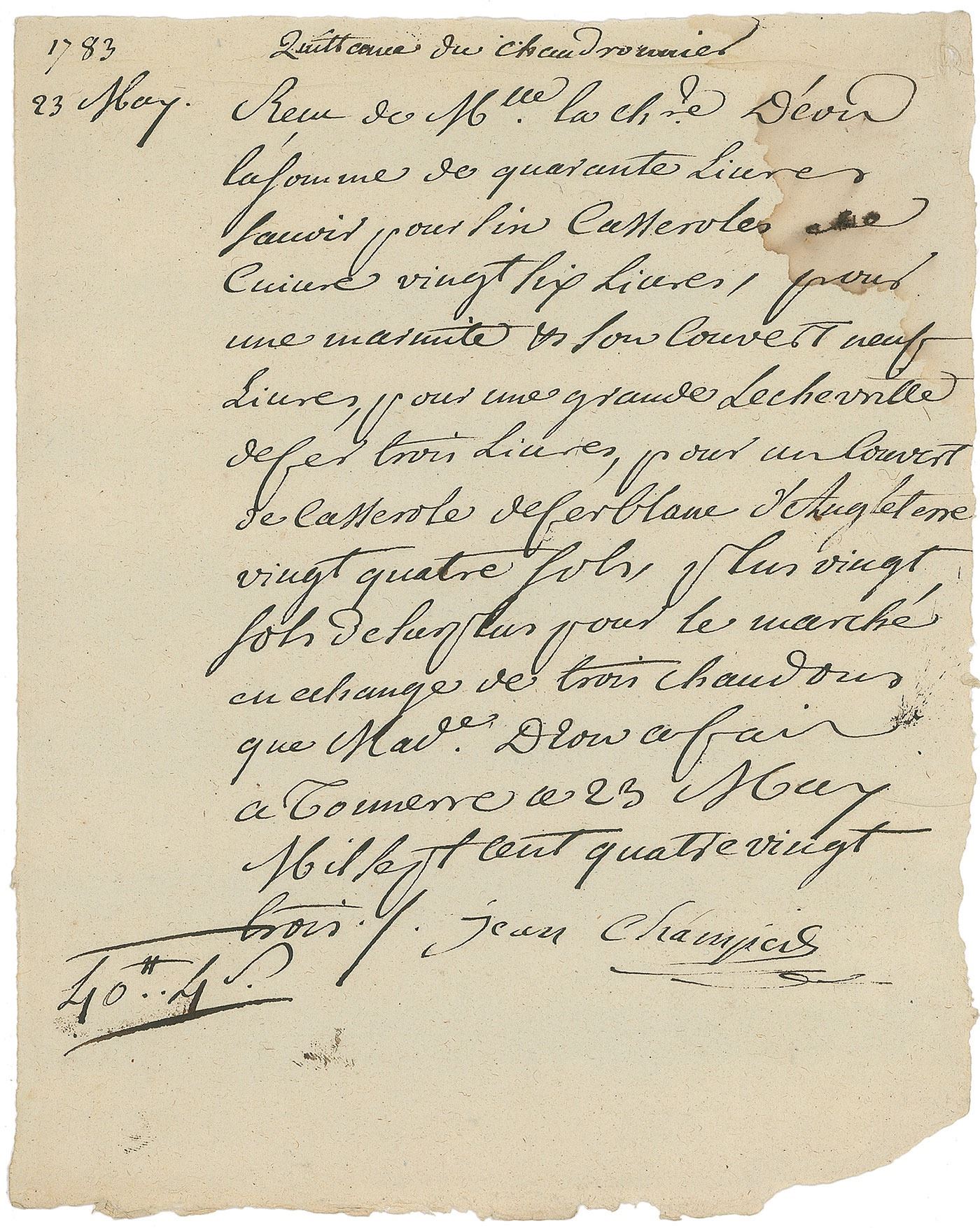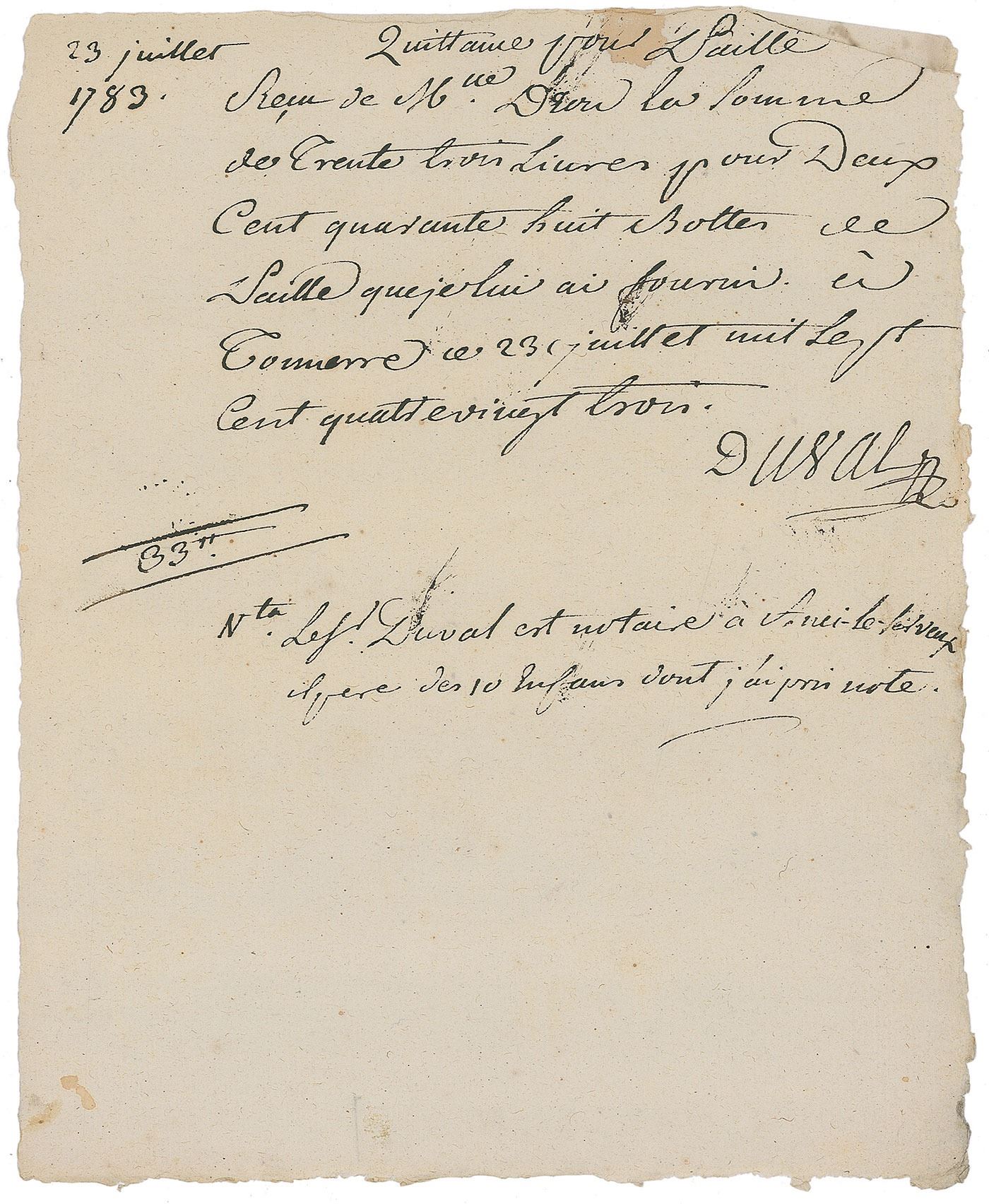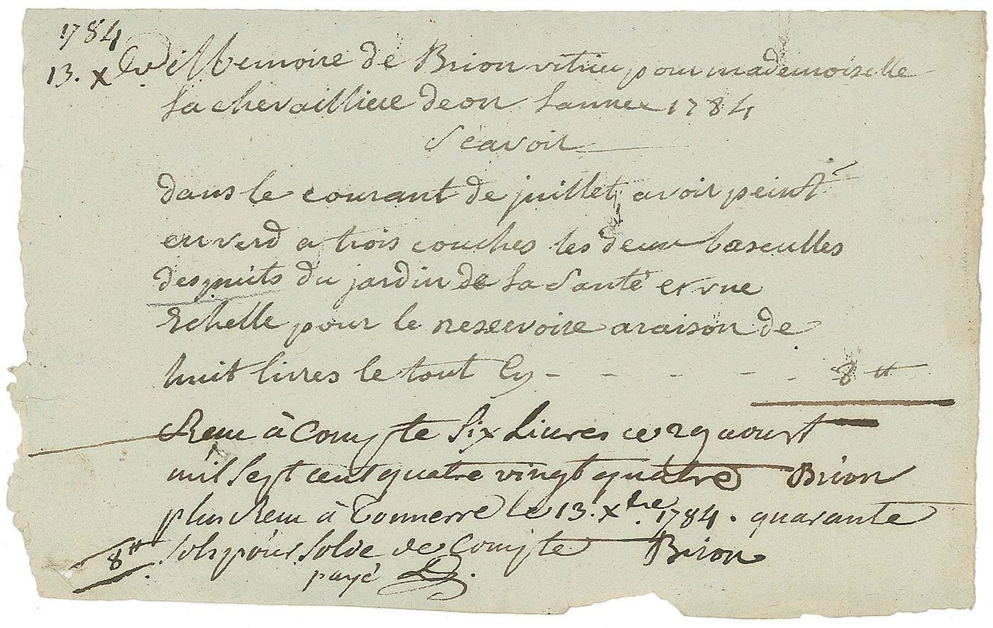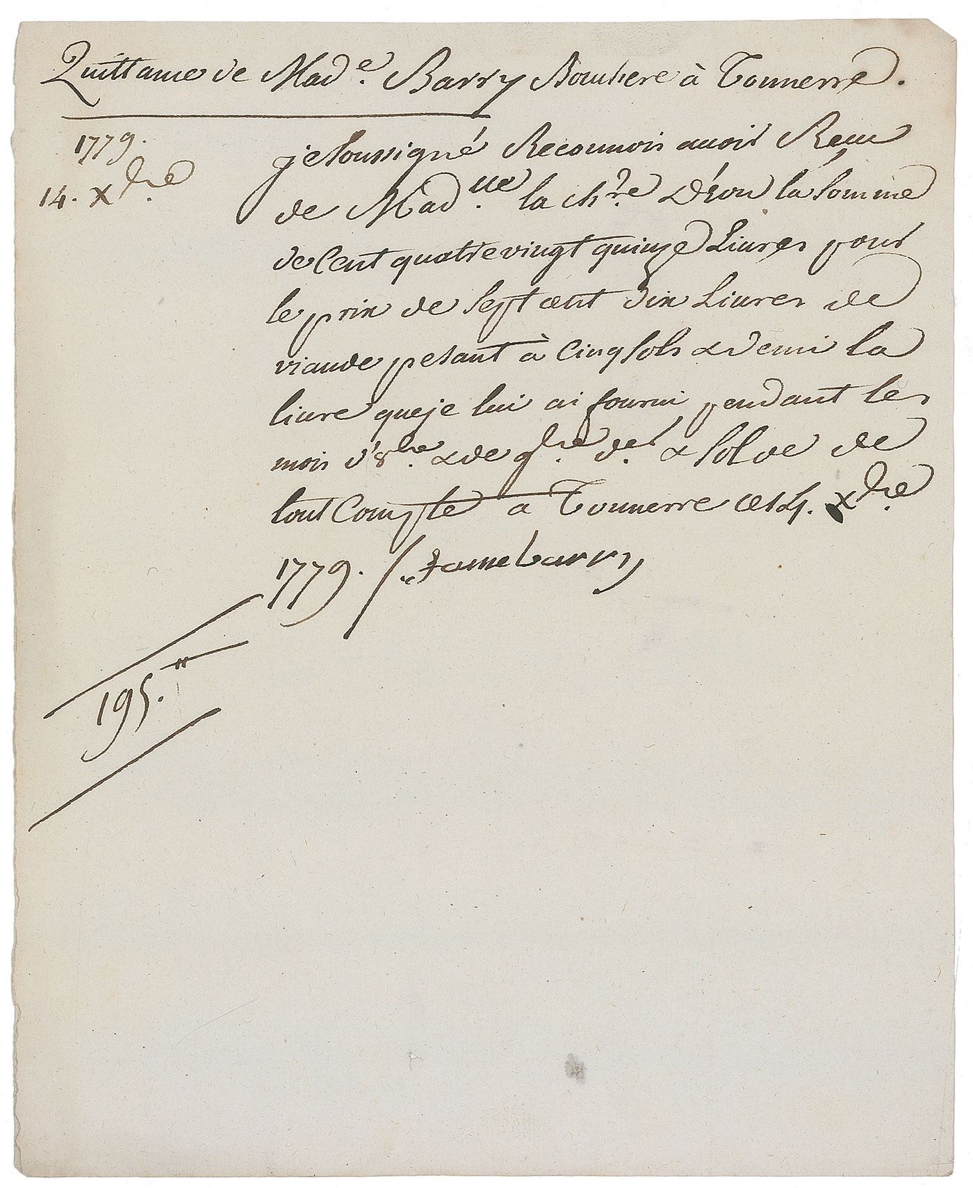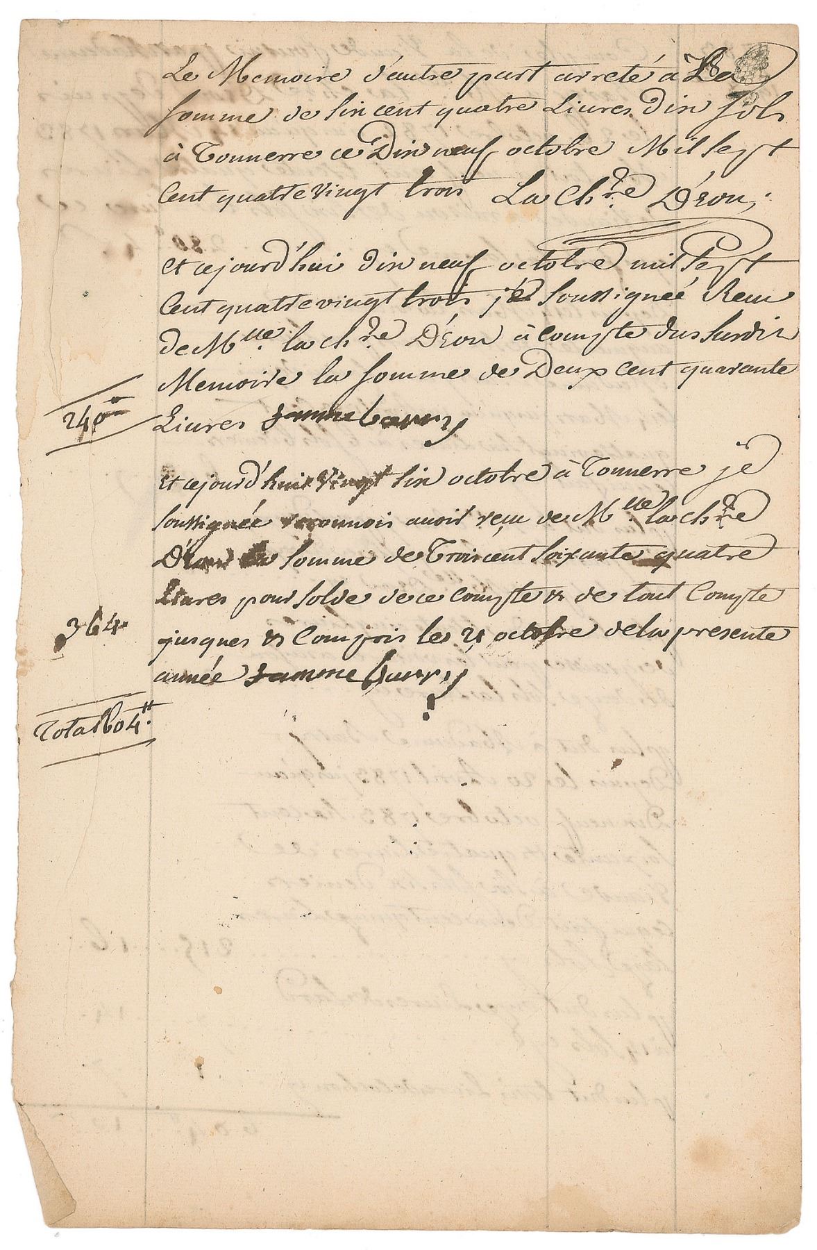 French diplomat, spy, and soldier (1728–1810) whose first 49 years were spent as a man, and whose last 33 years were spent as a woman. Archive of eleven untranslated receipts or ledger pages listing household expenses such as prices for firewood, lumber, clothing, and other items, dated from 1779 to 1785. Seven are ADSs handwritten by Chevalier d'Eon and signed in the third-person within the text, with variations including "M'lle la ch're D'Eon," "M'lle D'Eon," "Mad'lle la ch're D'Eon," with one initialed at the conclusion instead, "D." Two are in another hand and signed at the conclusion, one endorsed and initialed "D," and the other signed "La ch're D'Eon." The final two are written in the hand of Chevalier d'Eon, but left unsigned. In overall very good to fine condition, with expected document wear. Accompanied by three additional documents in other hands. An especially interesting series of documents, as d'Eon identifies as 'mademoiselle' several times throughout, providing a level of insight into Chevalier d'Eon's unusual story.