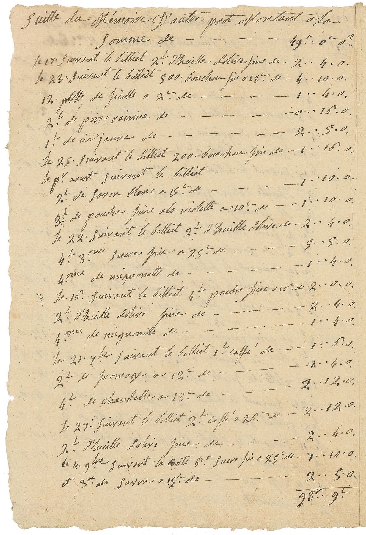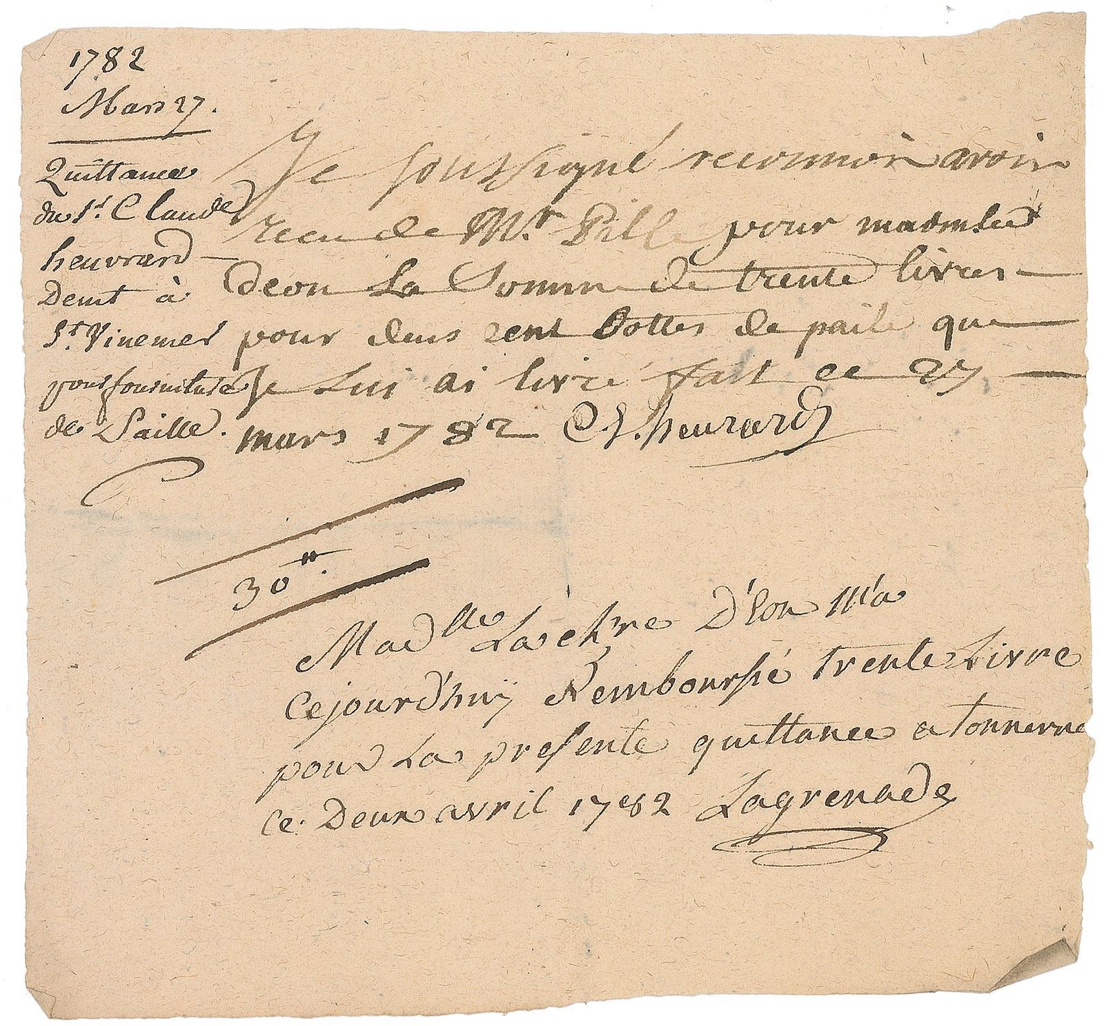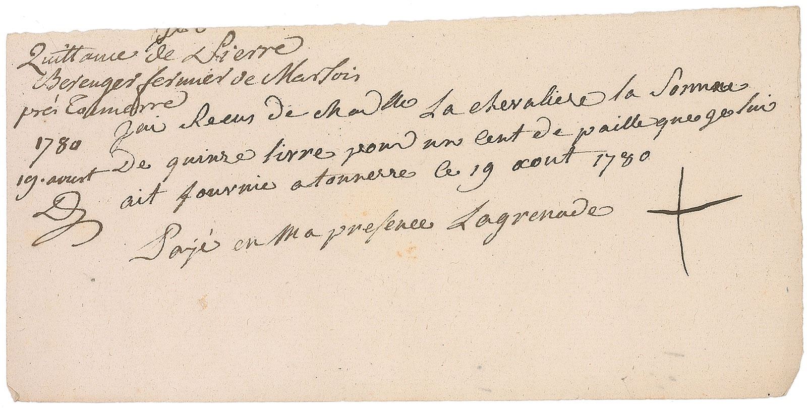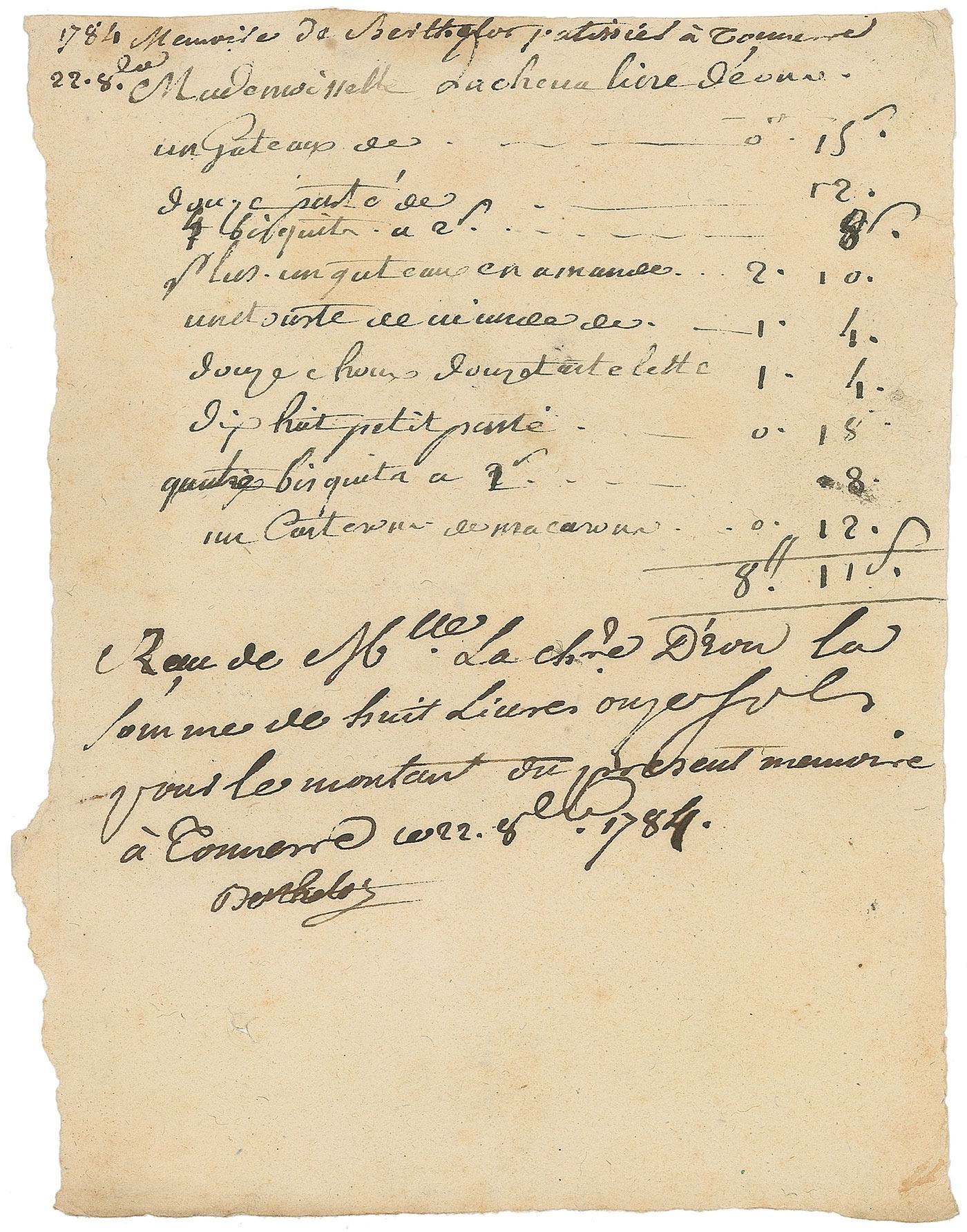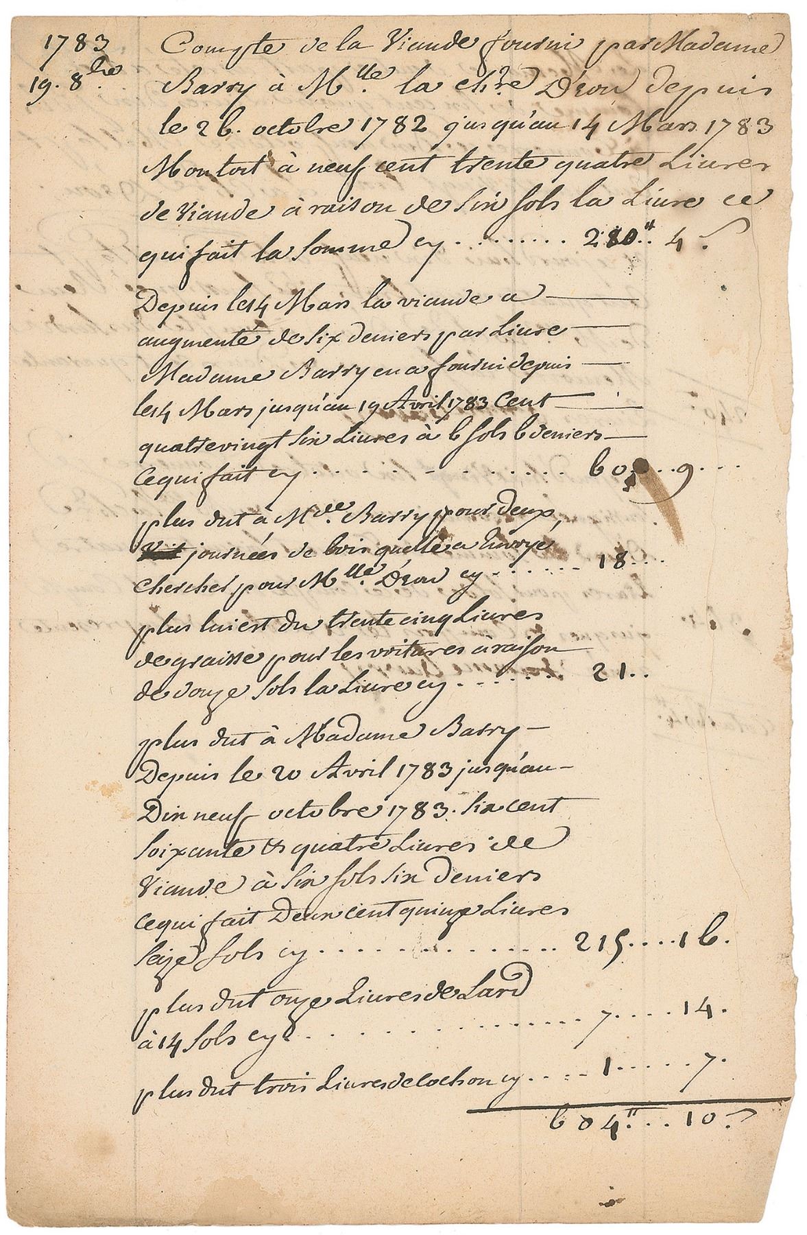 French diplomat, spy, and soldier (1728–1810) whose first 49 years were spent as a man, and whose last 33 years were spent as a woman. Archive of eleven untranslated receipts or ledger pages listing household expenses such as prices for firewood, lumber, clothing, and other items, dated from 1779 to 1785. Seven are ADSs handwritten by Chevalier d'Eon and signed in the third-person within the text, with variations including "M'lle la ch're D'Eon," "M'lle D'Eon," "Mad'lle la ch're D'Eon," with one initialed at the conclusion instead, "D." Two are in another hand and signed at the conclusion, one endorsed and initialed "D," and the other signed "La ch're D'Eon." The final two are written in the hand of Chevalier d'Eon, but left unsigned. In overall very good to fine condition, with expected document wear. Accompanied by three additional documents in other hands. An especially interesting series of documents, as d'Eon identifies as 'mademoiselle' several times throughout, providing a level of insight into Chevalier d'Eon's unusual story.