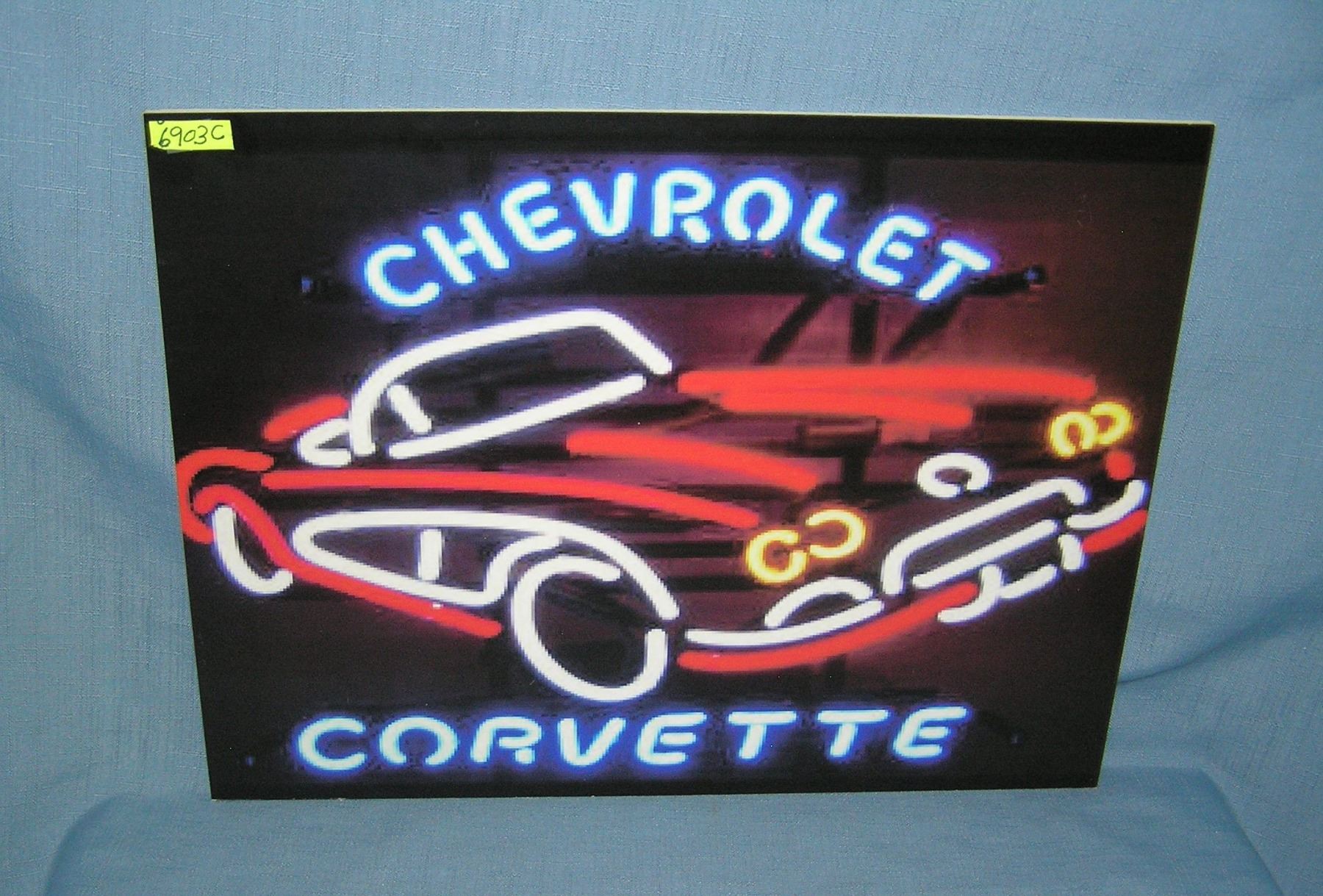Chevrolet Corvette neon retro style retro style advertising sign printed on PVC hardboard these signs are auctioned for their decorative and display purposes 12 inches by 16 inches est. value $50.00-$60.00