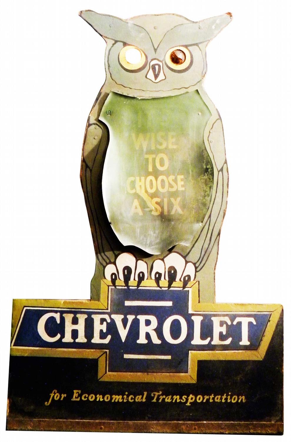 Chevrolet Masonite Light Up Display. Owl with blinking eyes. Some restoration otherwise good working condition. 22 X 34 1/2 inches.