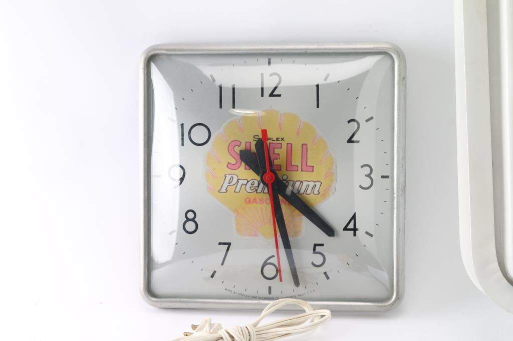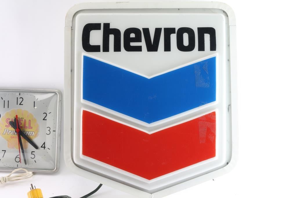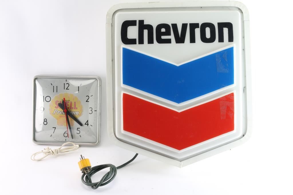 Original. Chevron measures 22" X 19" X 6". Has a working light w/switch and is in good condition. Shell measures 10 1/2" X 10 1/2" X 4" and is not lighted. Good working condition.