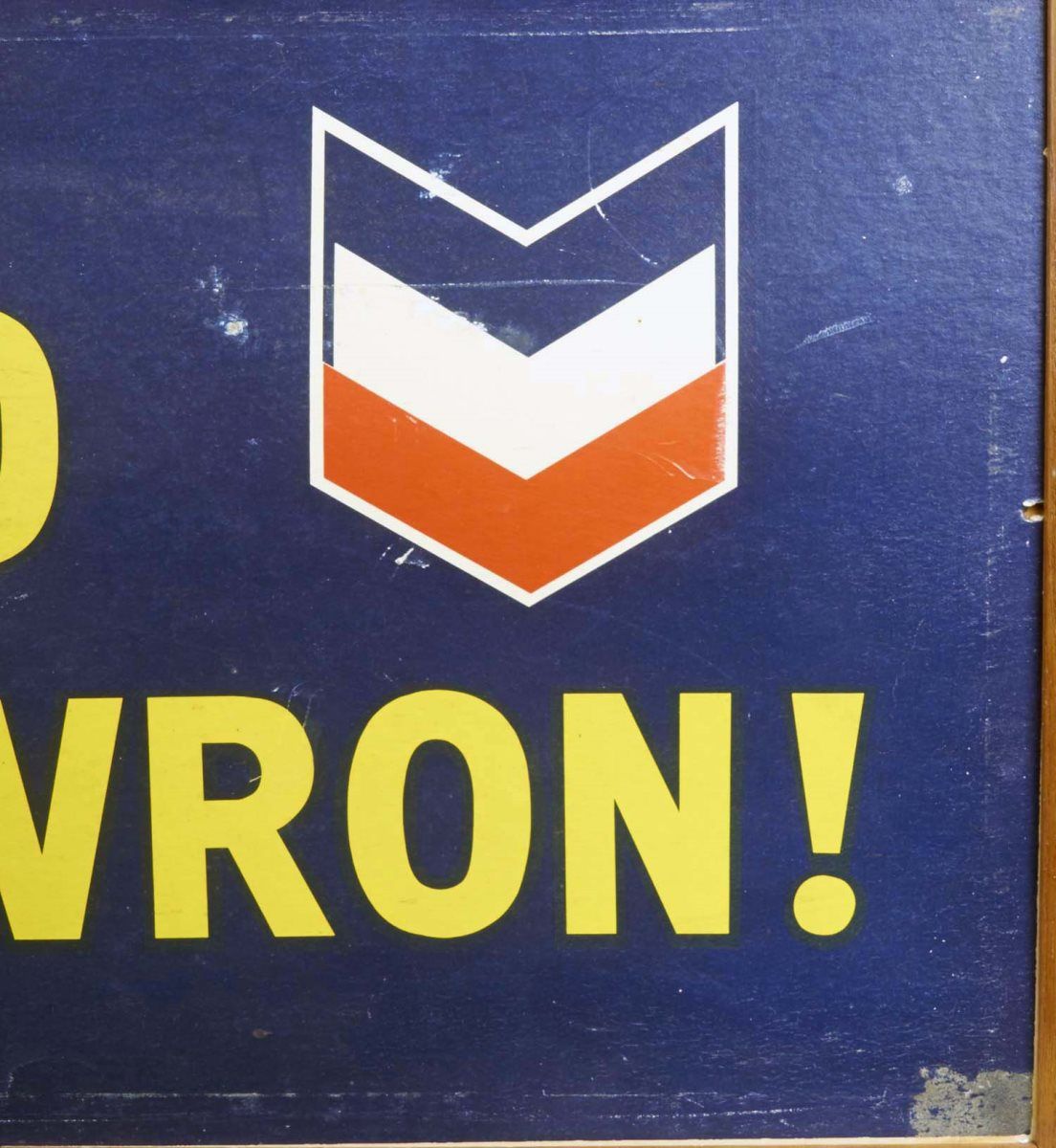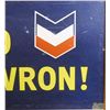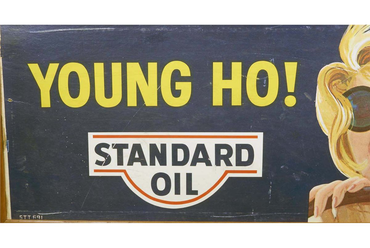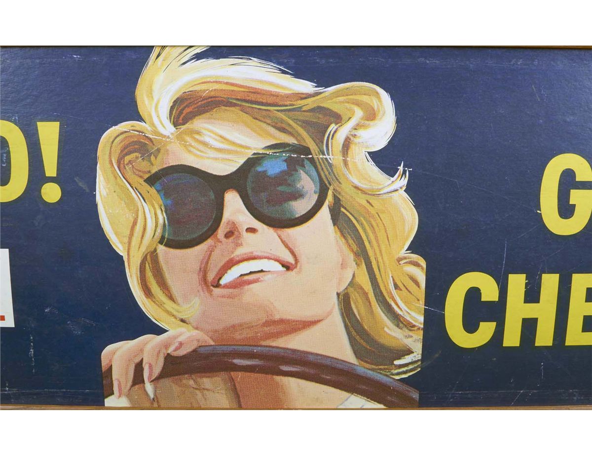 "Young Ho! Go Chevron!" Standard Oil advertisement sign featuring pretty blonde lady in sunglasses driving. Marked "STT691" without glass in frame. Nice original condition with some minor wear from age. Condition (Good). Size 13-3/4" x 48-3/4"