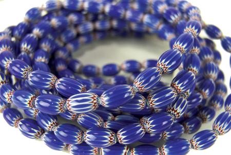 Circa Late 1900s, Four strands of 1/2" x 5/16" superfine six-layer red, white, and blue oval chevron trade beads. Excellent condition, highly polished. 1/2" each bead
