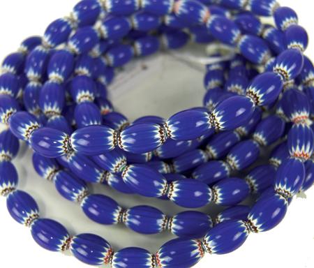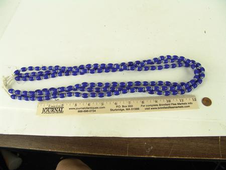Circa Late 1900s, Four strands of 5/8" x 3/8" fine six-layer red, white, and blue oval chevron trade beads. Excellent condition, highly polished. 5/8" each bead