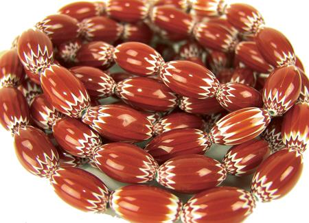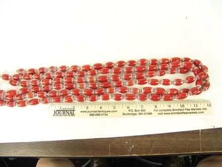 Circa Late 1900s, Four strands of 7/8" x 5/8" fine six-layer red and white oval chevron trade beads. Excellent condition, highly polished. 7/8" each bead