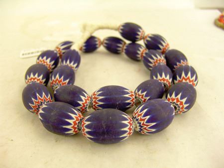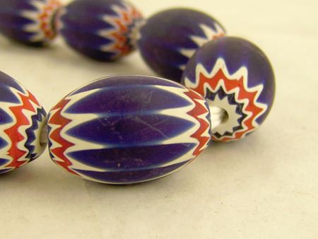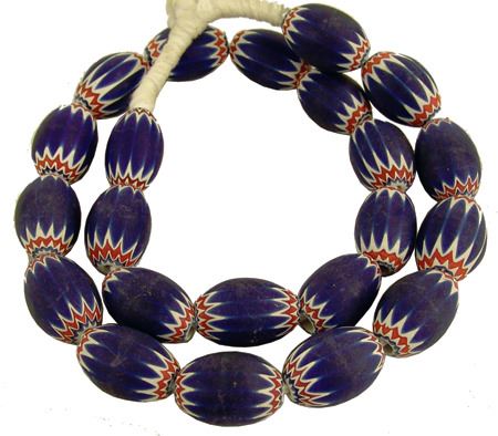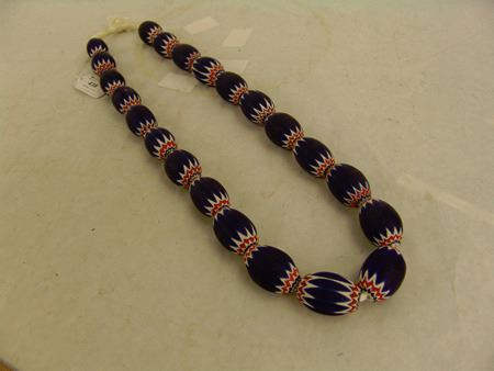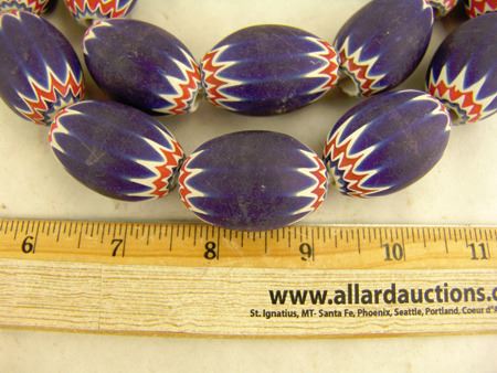 Mid/Late 1900s, Beautiful strand of 22 large (1"dia.+) six-layer oval chevron tradebeads. Very good condition. 36"