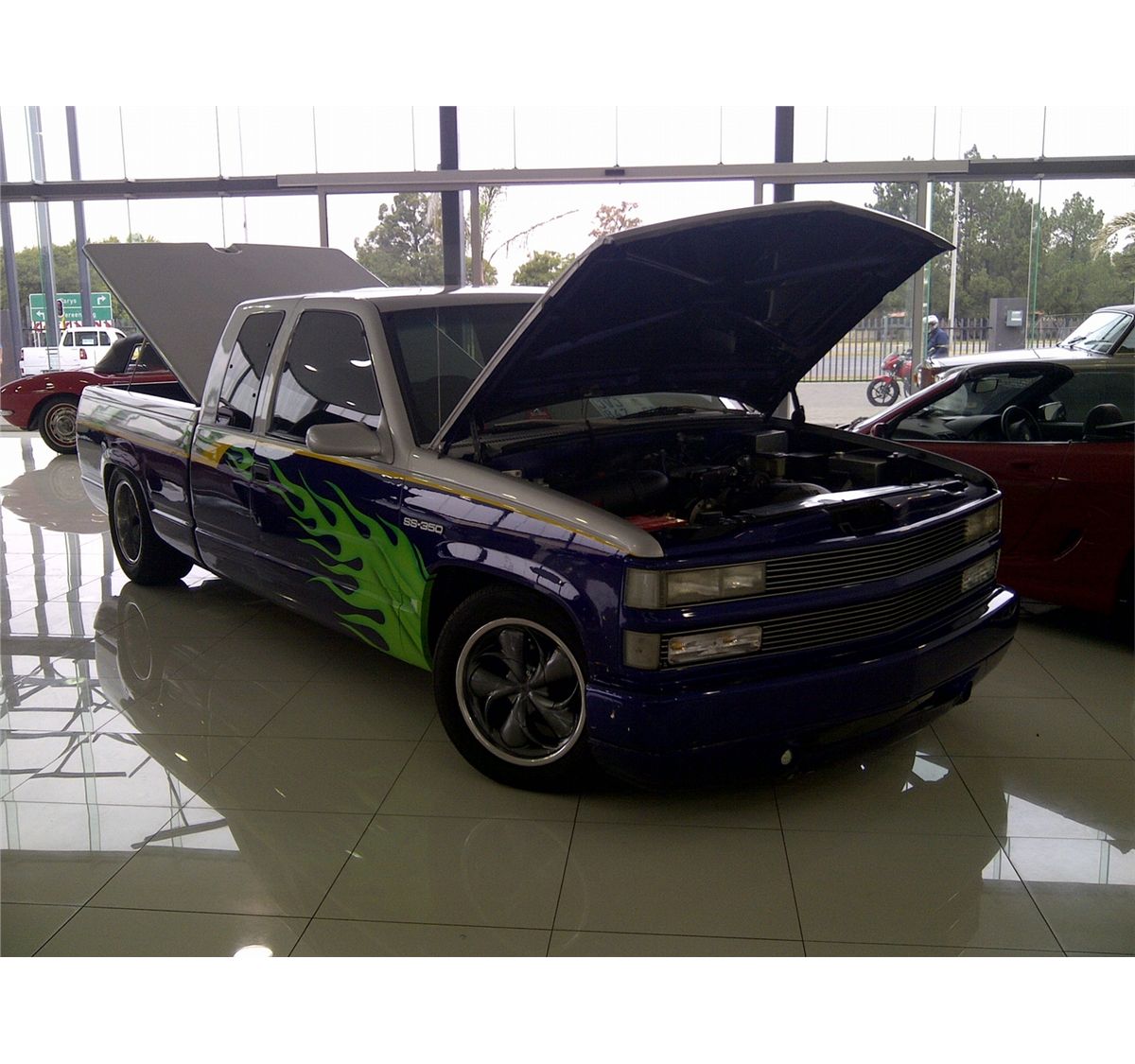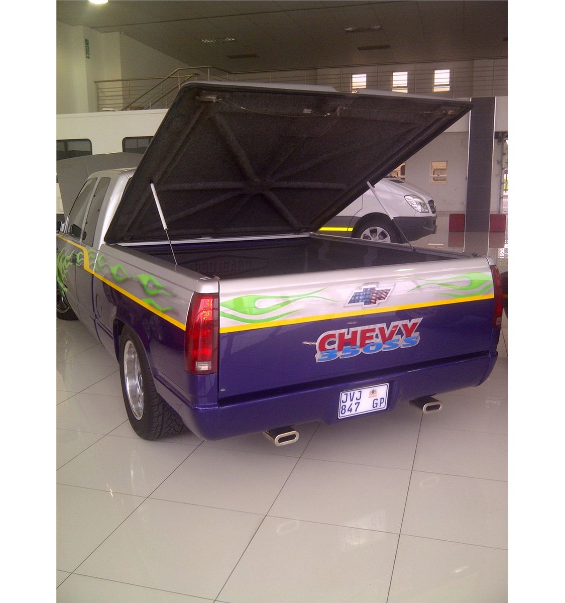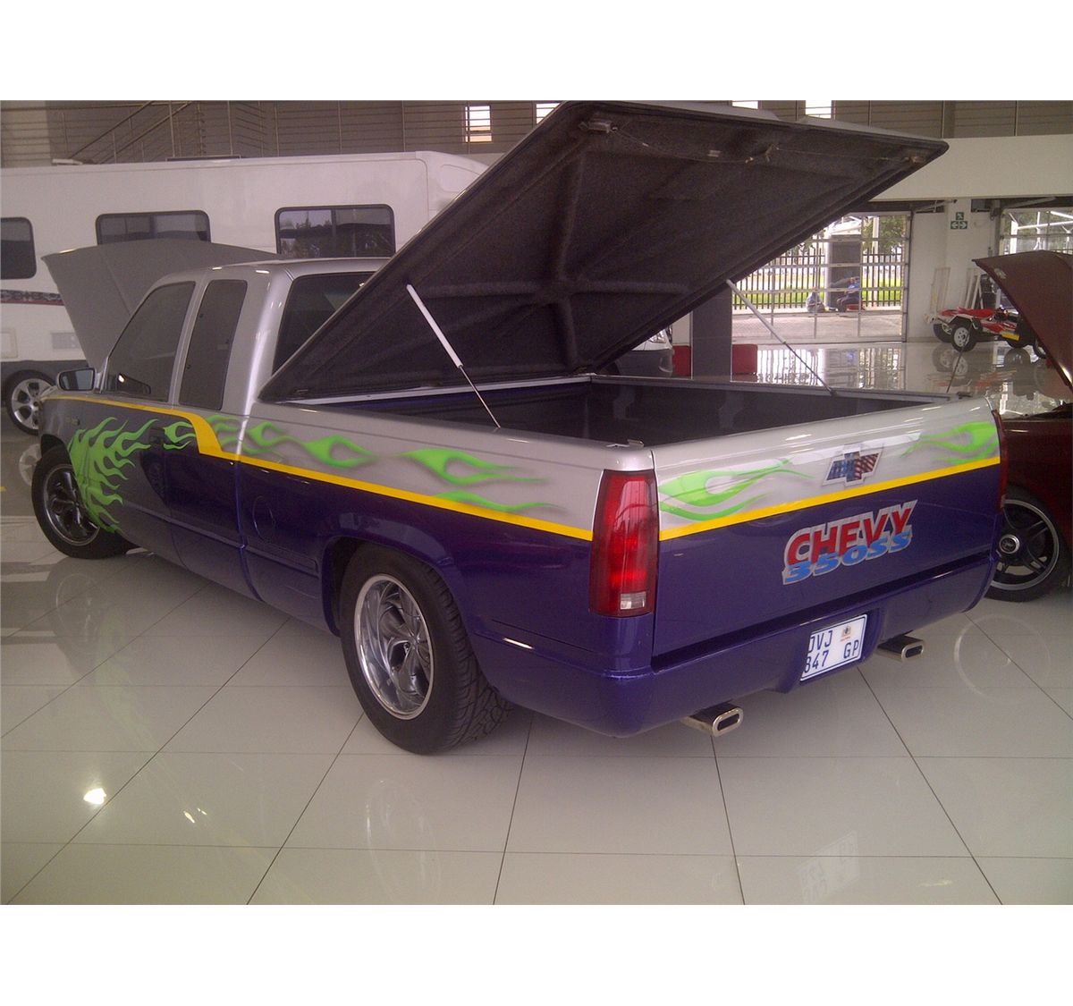 Make: Chevy 350ss, Year: 2007, Colour: Blue and Silver, Interior: Grey Leather, Mags: 17" inch wide rears and custom wheels, Motorplan: n/a, Features: 350 Chevy V8; Super charger; Custom Paint; Custom sound and screen; Custom leather; Extended double cab; Custom rear and cover with shocks; Left hand drive