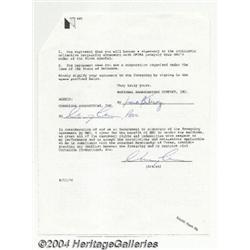 <B>Chevy Chase - Signed Agreement (1976).</B></I> A two-page, 8.5" x 11" agreement on NBC letterhead between NBC and Cornelius Productions, Inc. (Chevy Chase's production company), dealing with financial matters. Although this agreement postdates Chase's involvement with "Saturday Night Live", it's possible that it has to do with either the 1977 "Paul Simon Special" (for which Chase worked as a writer) or the 49th Annual Academy Awards, on which Chase was a presenter. No specific show is mentioned, however. The document is signed twice by Chase, once as President of Cornelius Productions, Inc., and once as "artist." In fine condition. <I>Accompanied by COA from PSA/DNA. </B></I> <BR><BR><B>Important notice:</B> Heritage usually auctions material at the rate of 200-250 lots per hour. On some occasions eBay Live bid software or the Internet may not be able to keep up with the pace of the auction. We recommend placing a realistic absentee bid now as insurance to avoid disappointment. Occasionally the auctioneer may eliminate or reject an eBay Live bid, and the auctioneer may also reopen a lot after the close of the eBay live bidding (usually because we missed an audience bid), and may reject your bid even if it shows you as the winning bidder. By bidding via eBay Live, you agree that Heritage may award the lot to another bidder at its sole discretion under the circumstances described above or any other reasonable circumstances. Since eBay bids are not shown to us until we open the lot on the floor, we treat those bids just like floor bids. In most cases the floor responds before the eBay bid is presented to us, due to Internet lag time, so for consistency we have made it a policy that floor bids are always considered first over tie eBay live bids. Also please note that all Heritage lots purchased through eBay Live carry a 24.5% Buyer's Premium. Please make sure you read the Terms and Conditions before you bid.