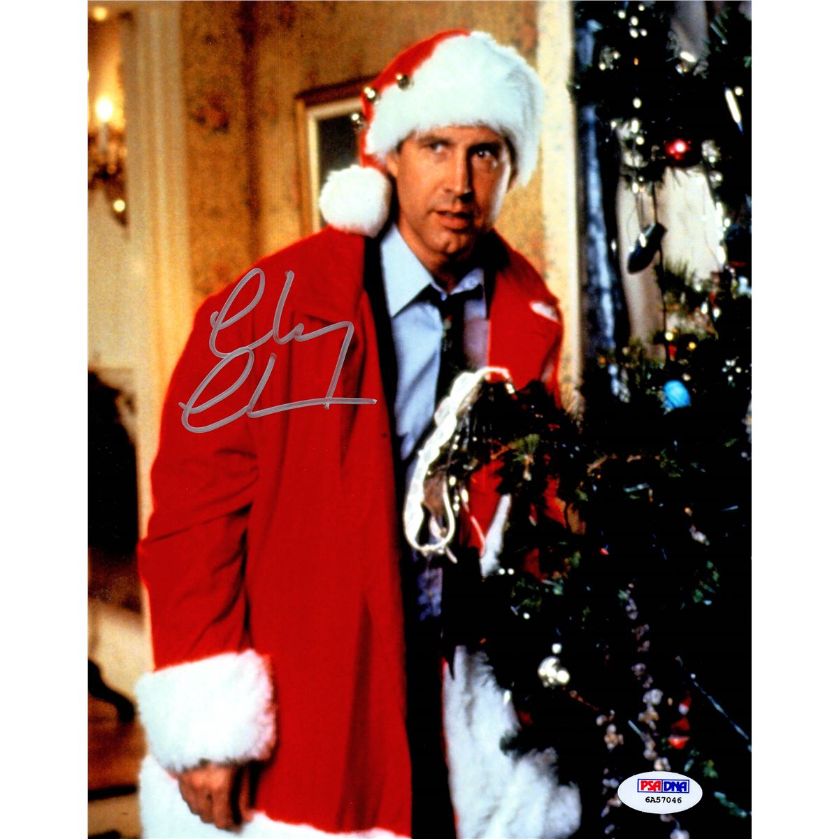 Chevy Chase signed Christmas Vacation standing next to Christmas tree 8x10 photo. Item comes with a PSA/DNA tamper evident numbered sticker and matching Certificate of Authenticity which can be verified online.