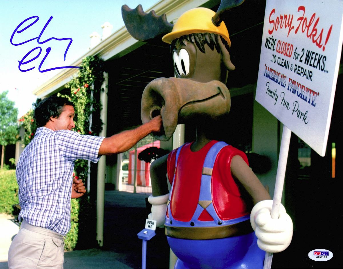Chevy Chase signed National Lampoon's Vacation punching Wally World moose 11x14 photo. Item comes with a PSA/DNA tamper evident numbered sticker and matching Certificate of Authenticity which can be verified online.