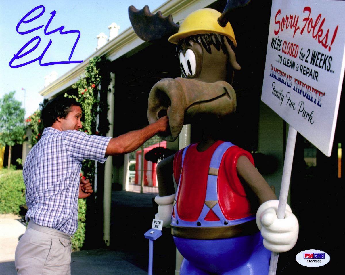 Chevy Chase signed National Lampoon's Vacation punching Wally World moose 8x10 photo. Item comes with a PSA/DNA tamper evident numbered sticker and matching Certificate of Authenticity which can be verified online.