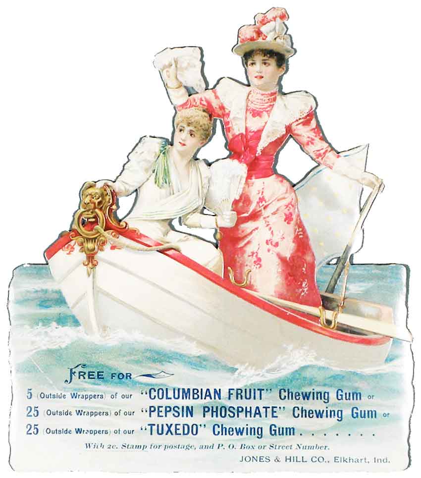 Chewing Gum Embossed Die Cut Sign for Free by buying Columbian Fruit, Pepsin Phosphate and Tuxedo Chewing Gum. Jones & Hill CO. Elkhart, Ind. Framed under glass. Near mint condition. 6 1/4 X 7 1/4 inches.