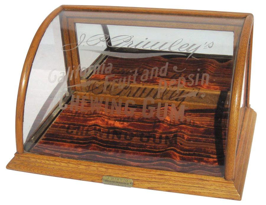 Chewing gum display case for J.P. Primley's California Fruit & Pepsin Gum, c.1900, Exc cond, 10"H x 17"W.