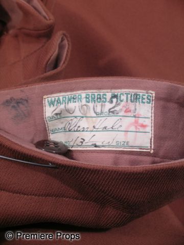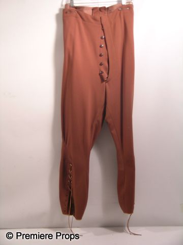 A pair of screen worn pants worn by Alan Hale Sr. for his role as Fred Durkin in the 1947 Western adventure 'Cheyenne.' The button front pants are made with thick, heavy 'burnt sienna' colored fabric with shoe string ties for fastening at the ankles, giving it a semblance of a pirate style. The label inside reads 'Warner Bros. Pictures 20602 Alan Hale.'
