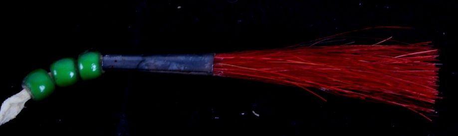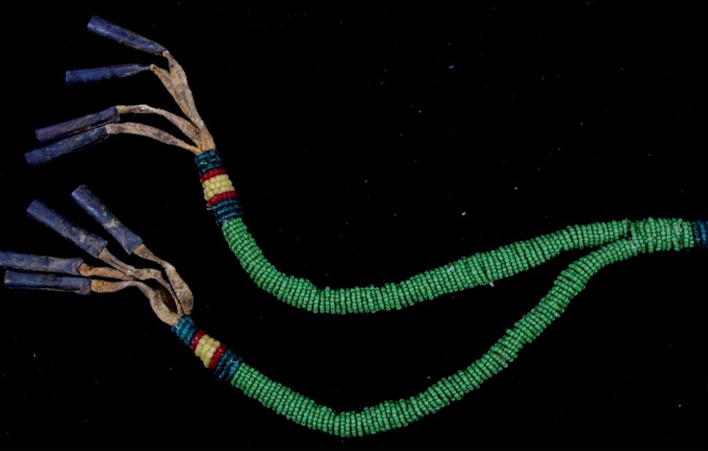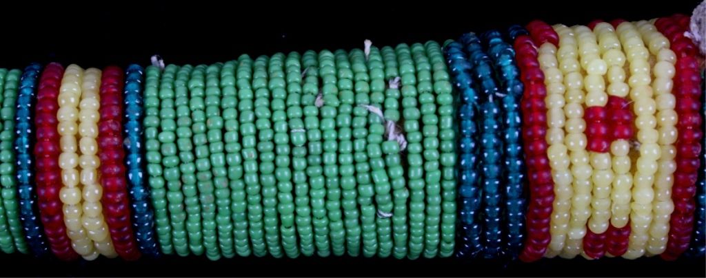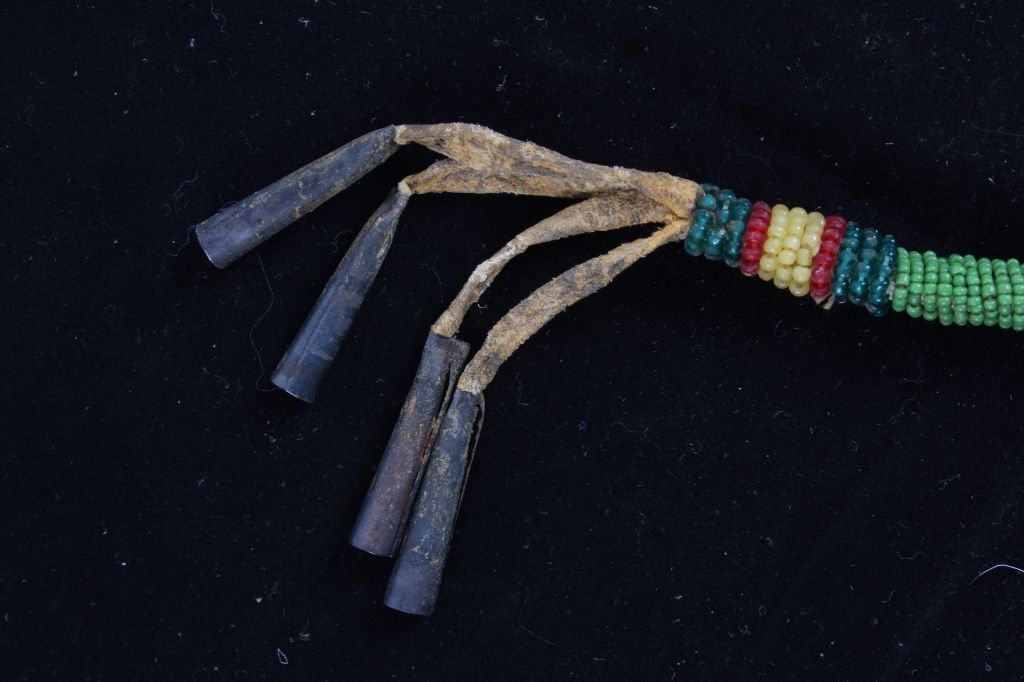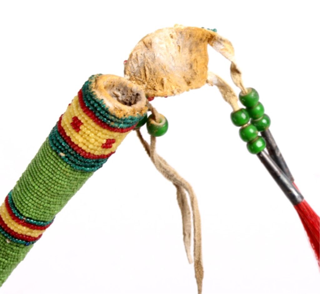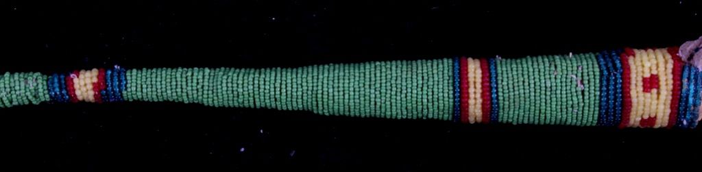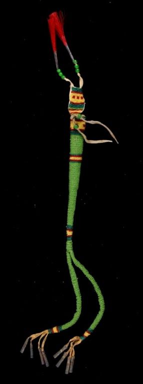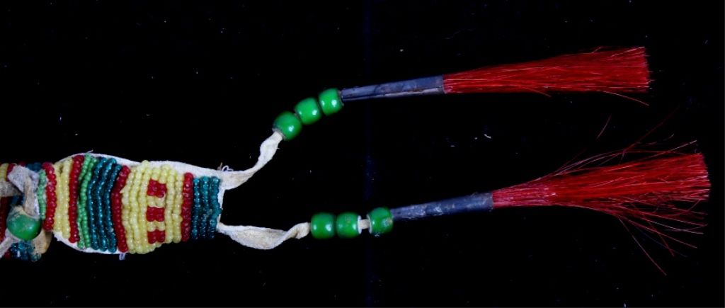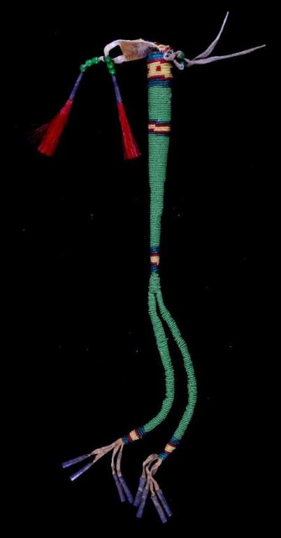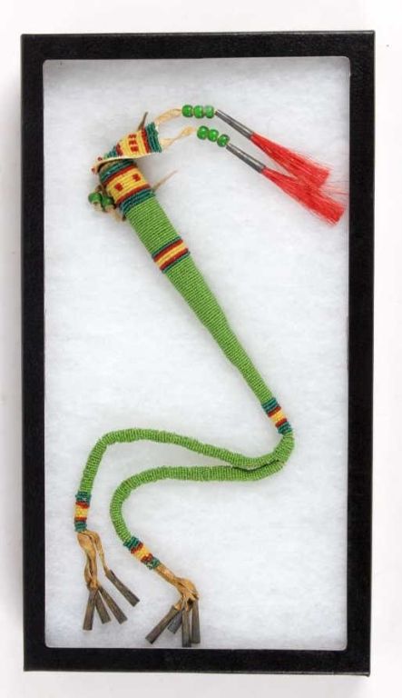 The piece features original 1800's glass small seed beads with double beaded drops and very fancy design. This was hand made by the Montana Cheyenne Native American in circa 1880-1910 and is an impressive well done AwlCase showing beaded fringe and Hudson Bay white heart beads. Measures 16.5" long with the fringe. This comes in a glass top black case measuring 14.5"x8"