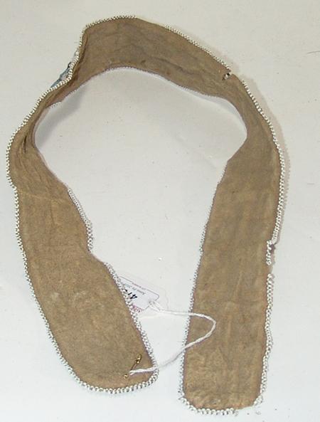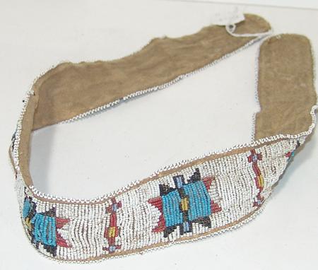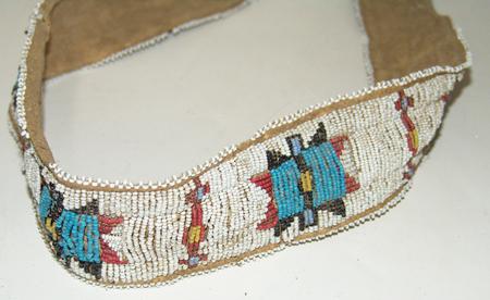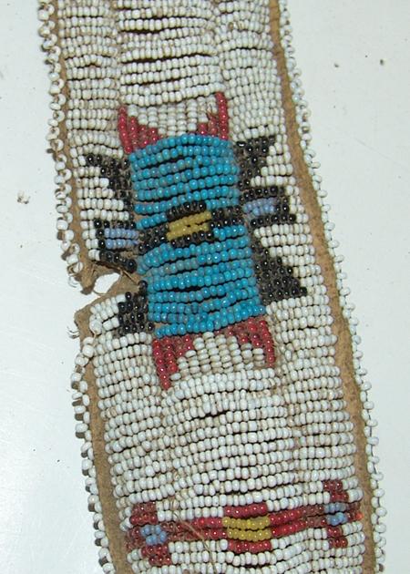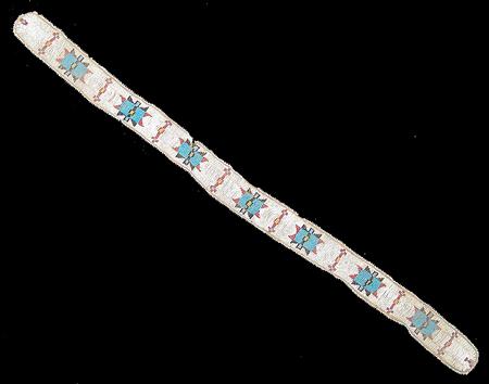 Classic old sinew sewn and lazy stitch beaded belt with unusual rounded ends and 8-point Valero star designs; the red beads are all whiteheart seed beads. Condition: good, a few missing beads and a small tear. 33-1/2" x 2"