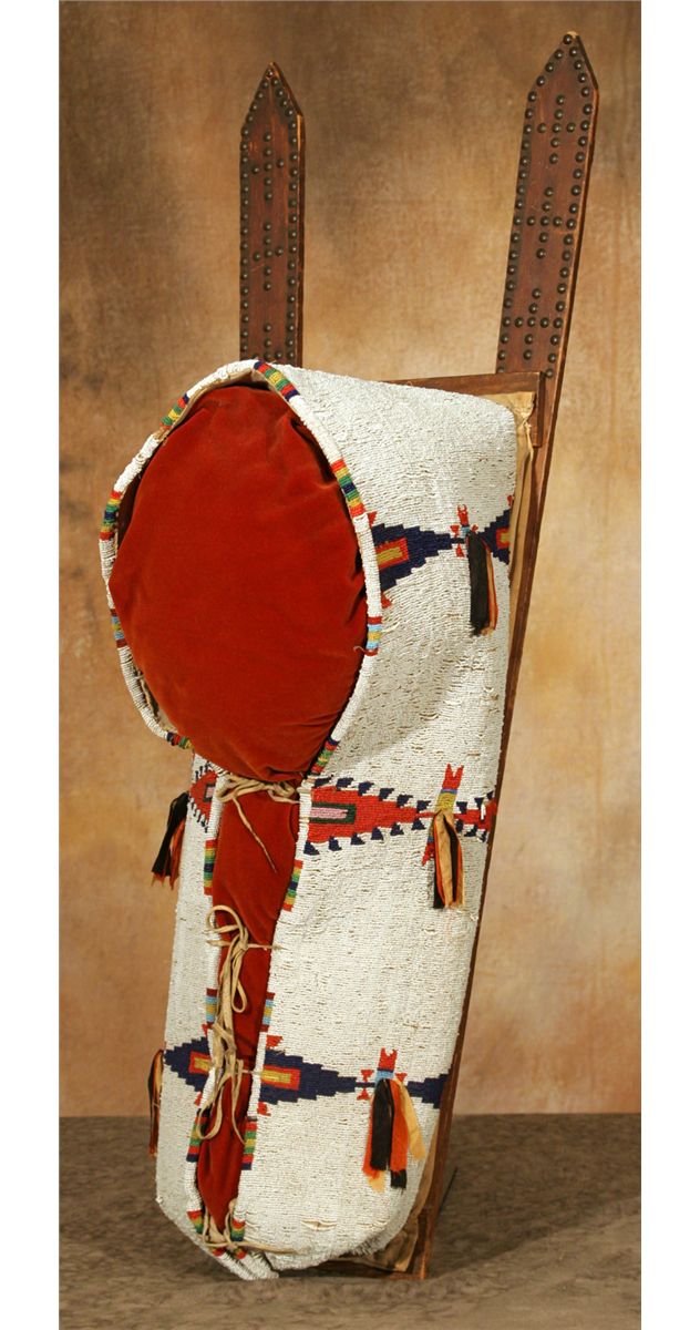 Cheyenne Cradleboard. 29" x 12" fully beaded cradleboard in classic design. Beaded in colors of white-heart red, yellow, two shades of blue, black and green on a white field. Tri-color ribbon accents. 42" original tacked sticks. Early 20th century. Provenance: Ex-Dr. Harry Deupree collection. Collection of Dr. Delwin and Karen Bokelman, PA., and pictured in their book Precious Dreams, page 11.