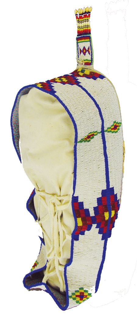 Ca. 1960s, Beautiful full-sized sinew sewn and lazy stitch beaded baby carrier with geometric designs on a white field with a rawhide back. Very good condition. 27-1/2" x 12" x 8-1/2"
