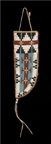Cheyenne Beaded Knife Case. 9" x 3 1/4". Fully beaded. Minor bead loss on edge. Otherwise beadwork is excellent. 19th century. (est $1,600-1,900)