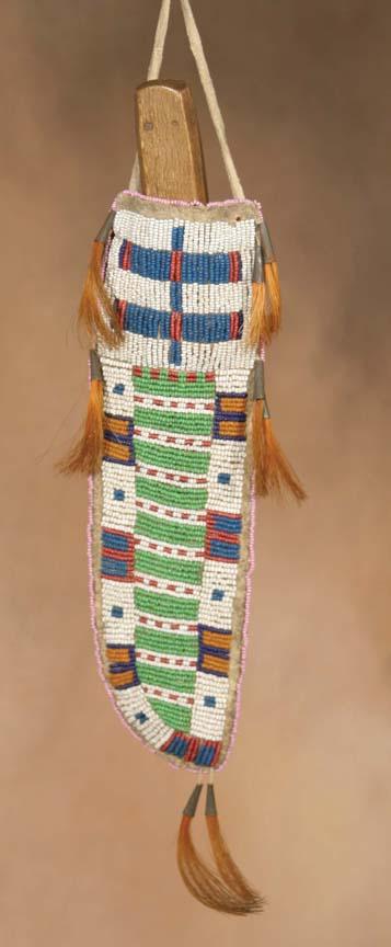 Cheyenne Beaded Knife Sheath. 10 ½" x 3" plus drops, 10 ½" knife. Nine tin cone & horsehair drops. G. Russell & Co., Green River Works knife. 19th century. (est $1,500-2,500). For condition reports please visit: www.auctioninsantafe.com/cr2011.pdf