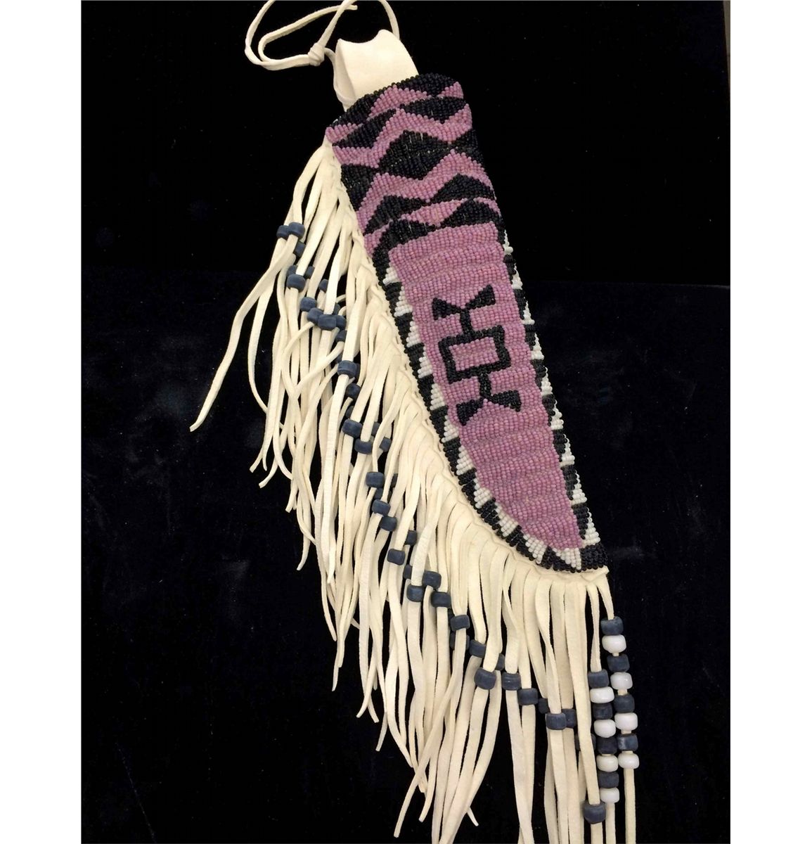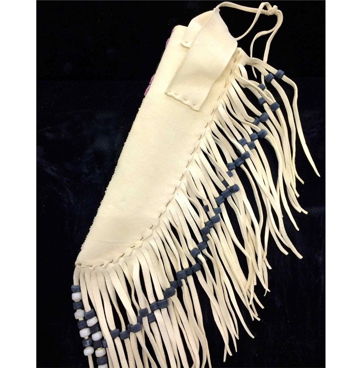 This knife sheath is done in the Cheyenne tradition and while not new, it has never been used (new old stock). Made with Deer hide. You’ll be a hit at the Pow Wow!