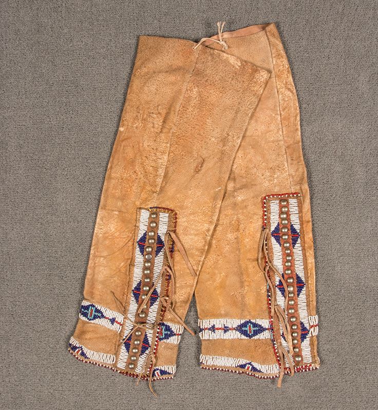 Cheyenne Beaded Leggings. 18" long x 7 ¼" at widest point. Decorated with silver tacks, red, white and blue beads, and a white and red beaded border along bottoms. Circa 1860's. Provenance: Otto Ernst Collection (Sheridan, WY).