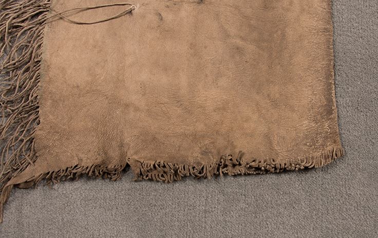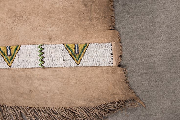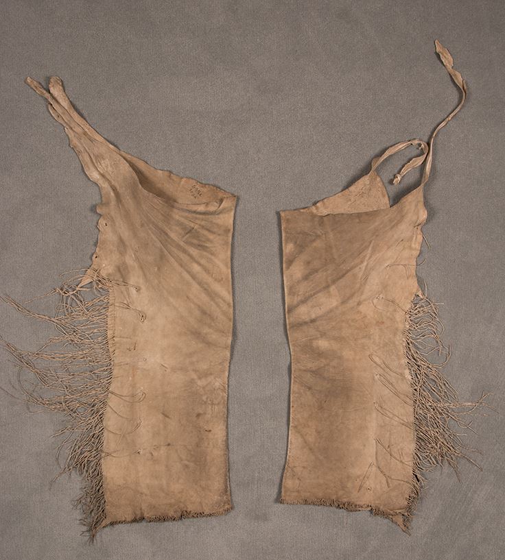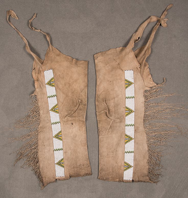 Cheyenne Beaded Leggings on Buffalo Hide. 27" x 10". Single beaded panel on buffalo hide accented with fringe that starts with 3" at the top and layers to 12" at the bottom. 19th century. Old collection number written on inside of left legging.