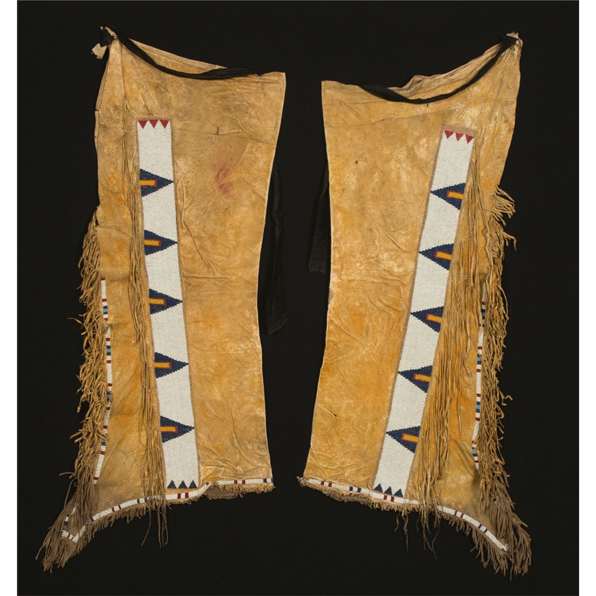 Cheyenne Leggings. 37" long flared leggings with beaded strips and a beaded edge. Remnants of green pigment. Nicely fringed. Circa 1880s. Mounted in a Plexiglas display case. Provenance: Estate of Jim Nicholls.